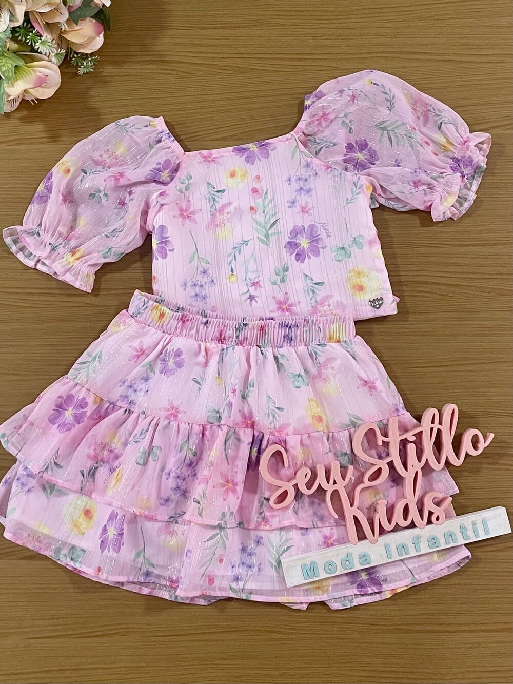 Conjunto Infantil Kukie Verão Saia e Blusa Chiffon Rosa Floral
