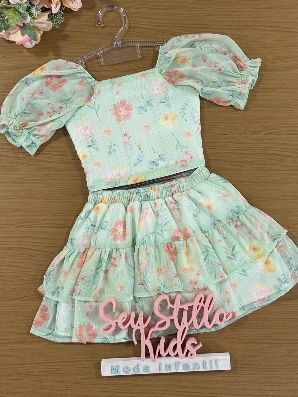 Conjunto Infantil Kukie Verão Saia e Blusa Chiffon Verde Floral
