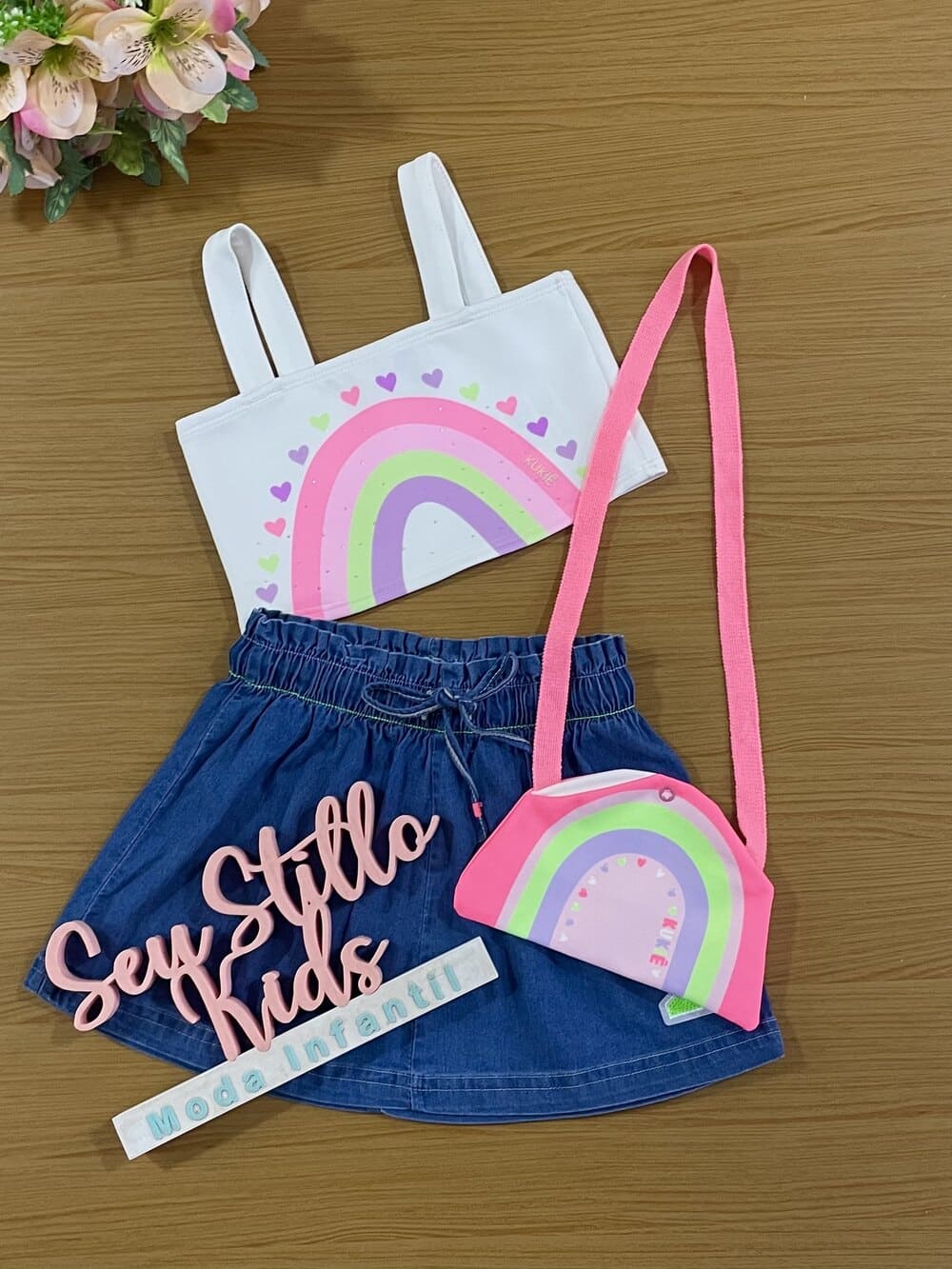 Conjunto Infantil Kukie Verão Saia Jeans e Top Cropped com Bolsinha Arco-íris