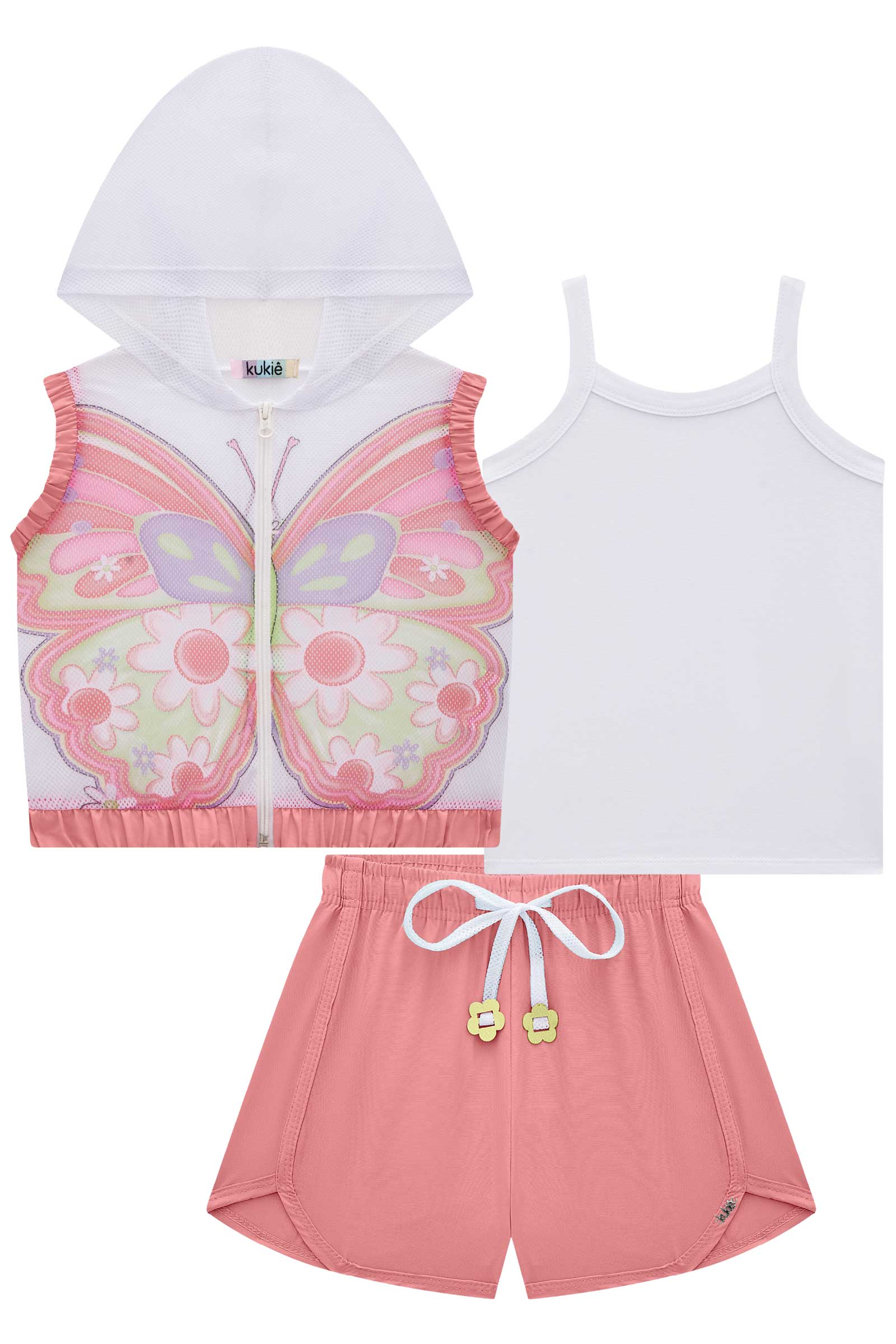 Conjunto Infantil Kukie Verão Shorts Coral, Top e Colete Borboleta
