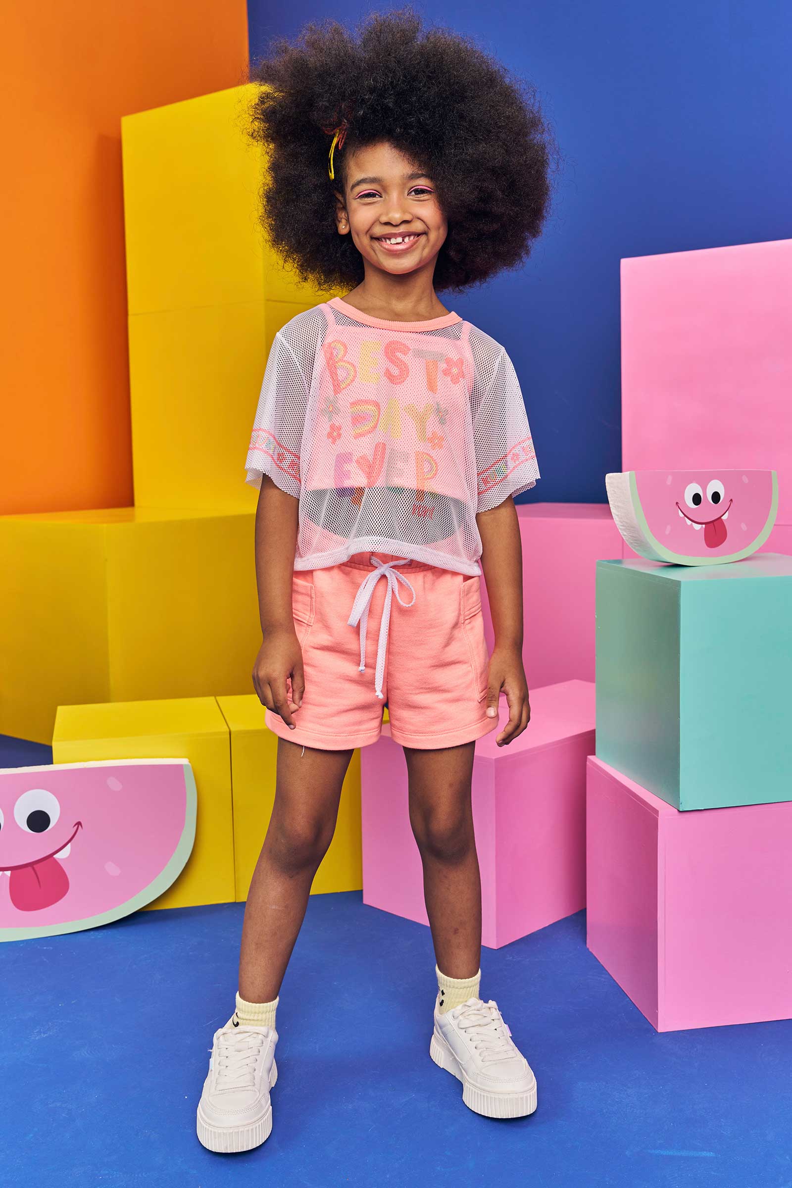 Conjunto Infantil Kukie Verão Shorts Coral, Top e Sobreposição Best