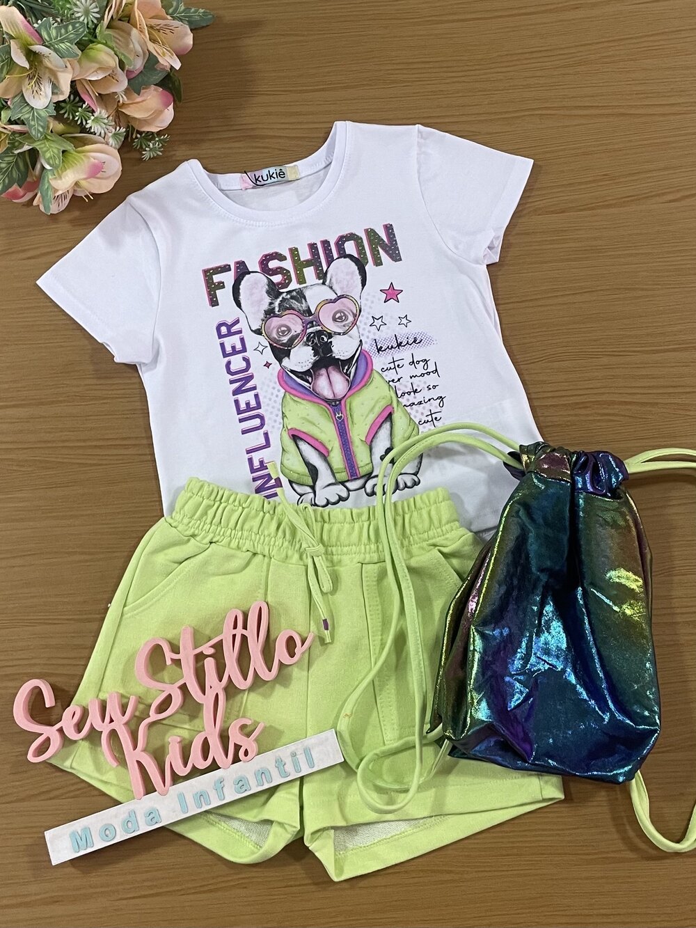 Conjunto Infantil Kukie Verão Shorts e Blusa Dog Fashion com Bolsinha