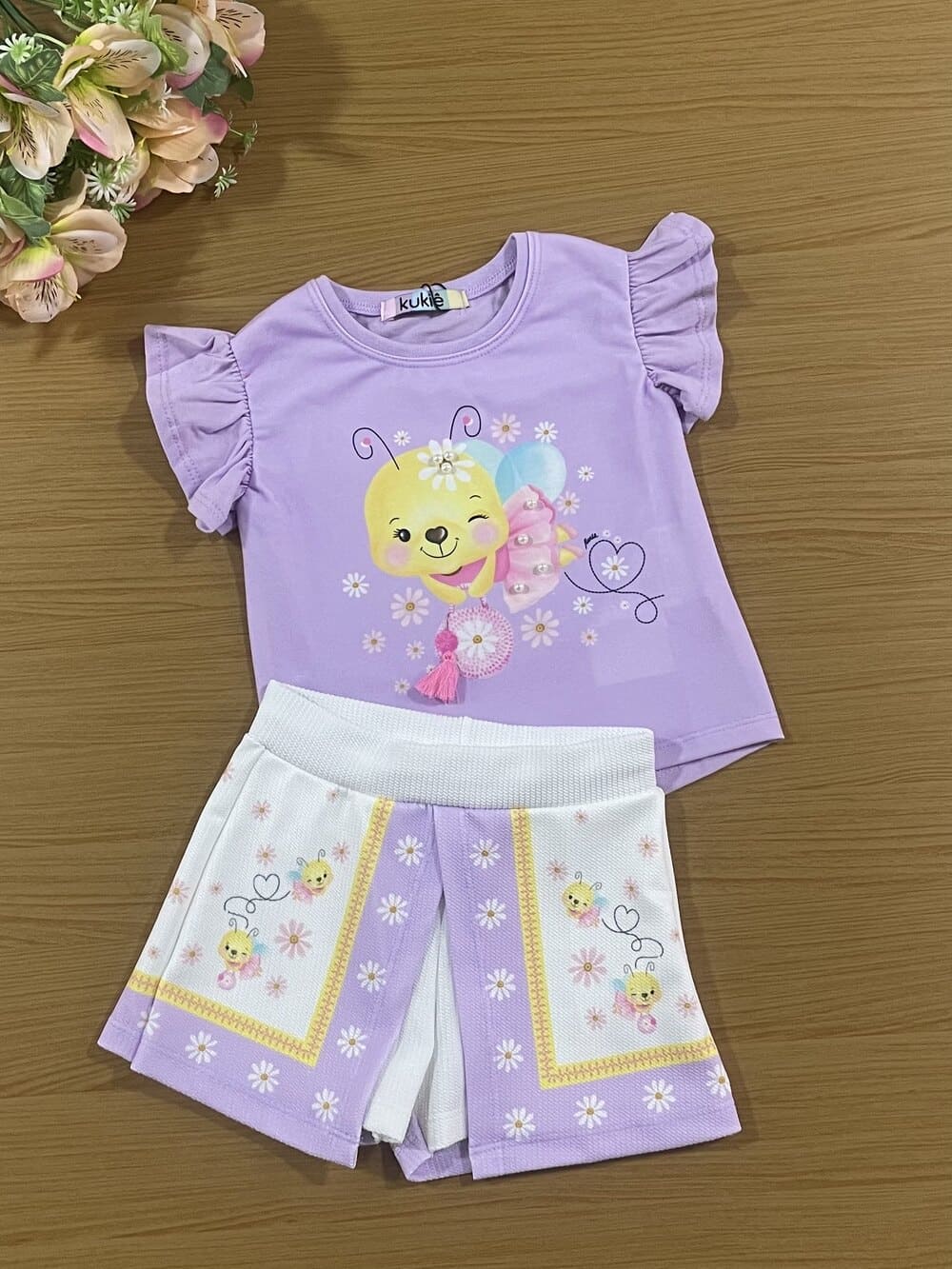 Conjunto Infantil Kukiê Verão Shorts e Blusa Lilás Abelhinha