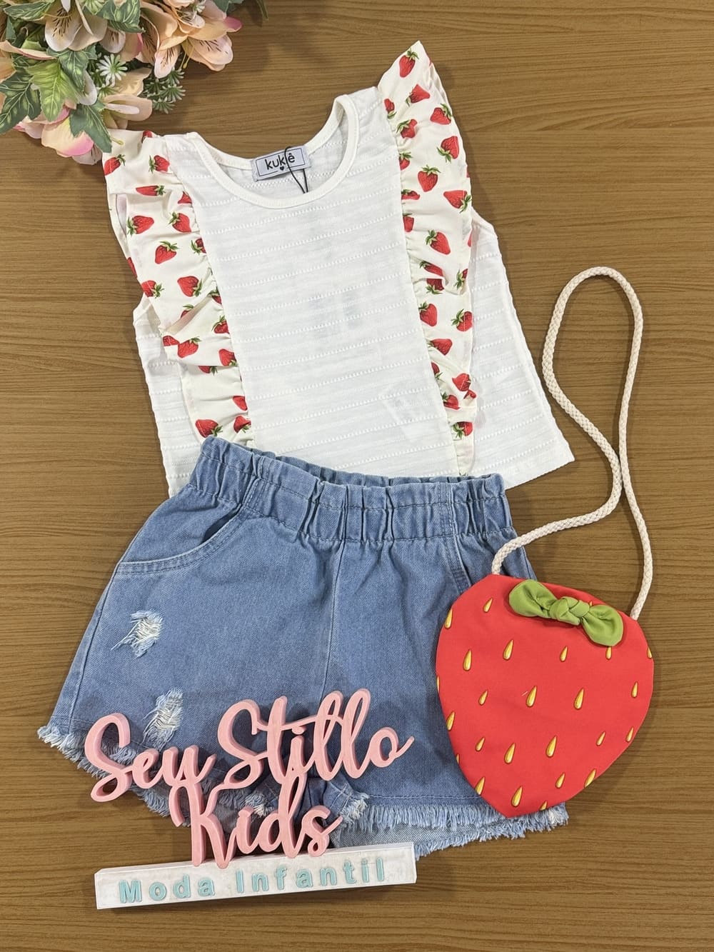 Conjunto Infantil Kukie Verão Shorts Jeans e Blusa Morango Com Bolsinha