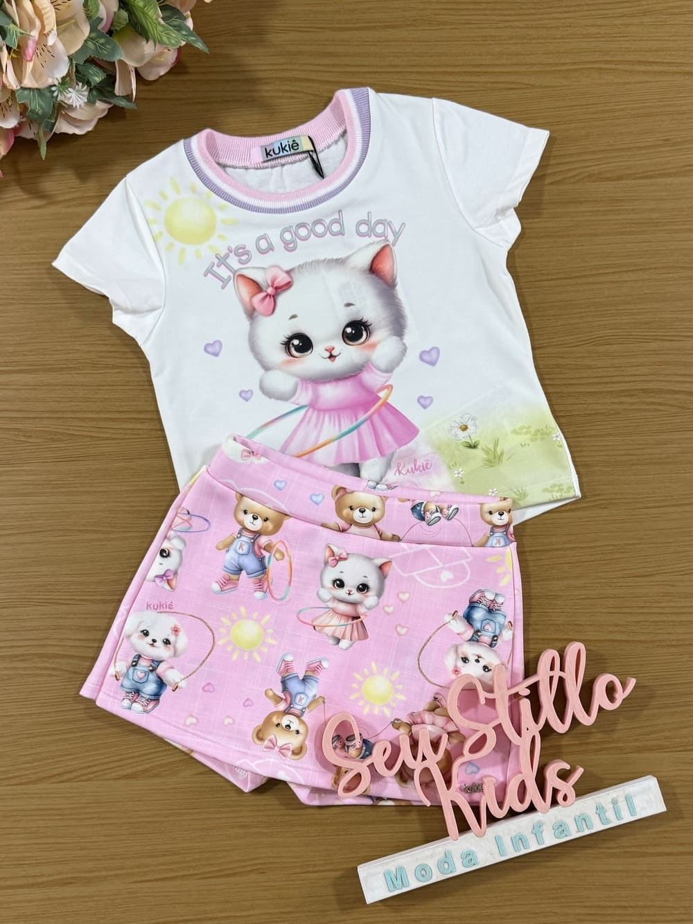 Conjunto Infantil Kukie Verão Shorts Saia e Blusa Gatinha