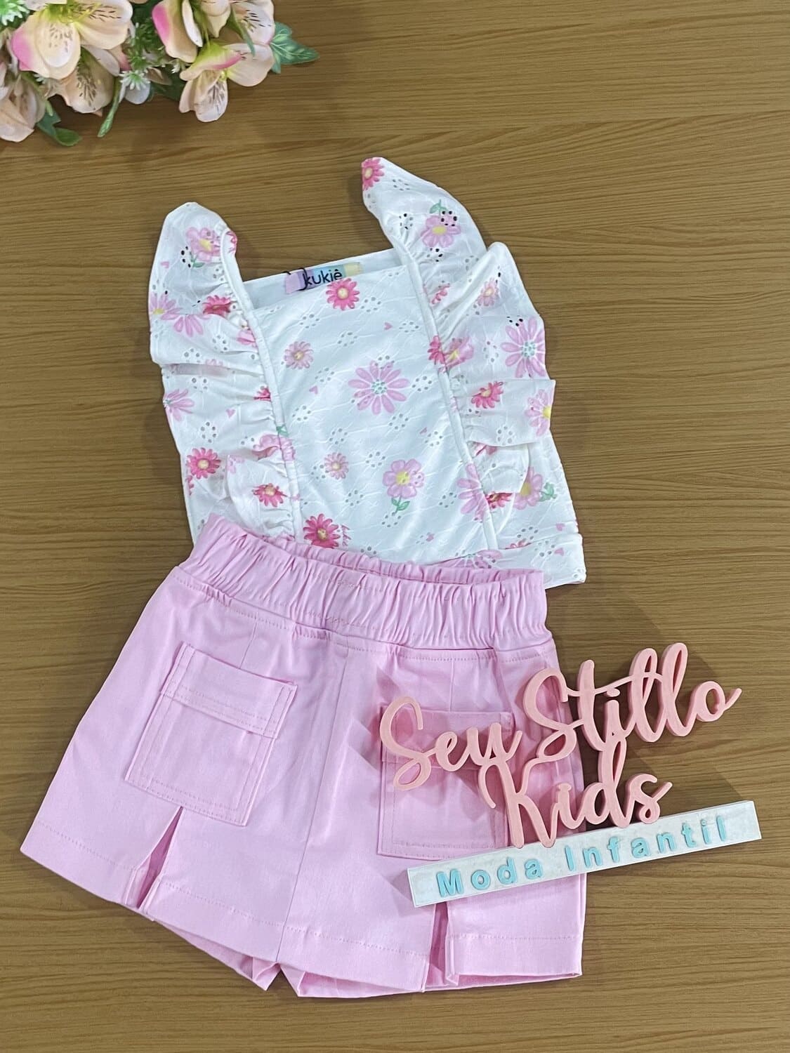 Conjunto Infantil Kukie Verão Shorts Saia Rosa e Blusa Boxy Flores