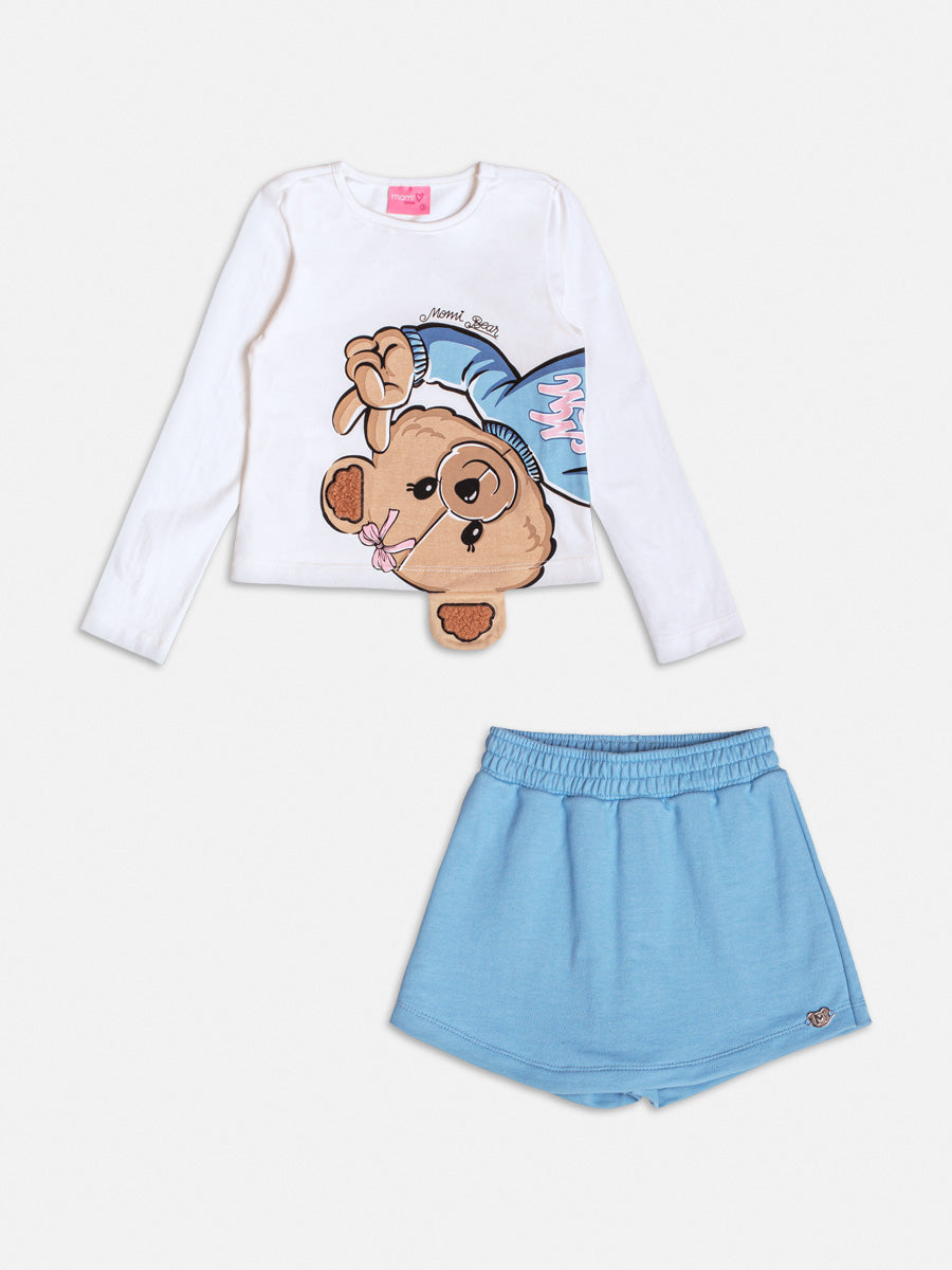 Conjunto Infantil Momi Inverno com Short-Saia Azul e Blusa Manga Longa Ursinha