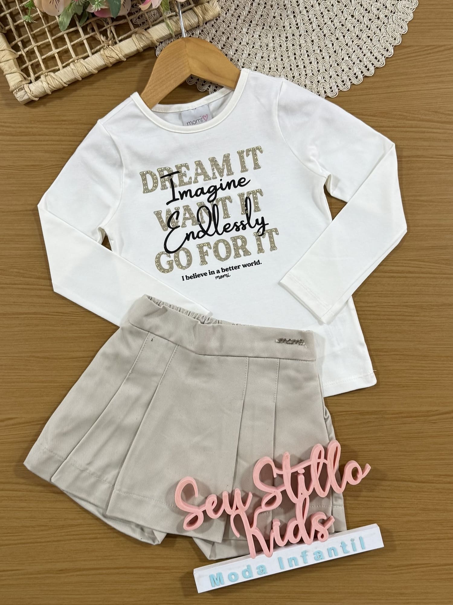 Conjunto Infantil Momi Inverno com Shorts Saia Bege e Blusa Manga Longa Branca Dream