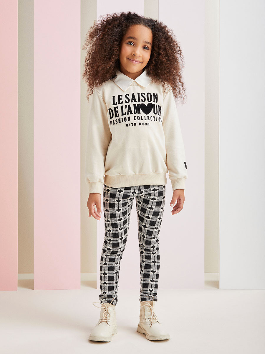 Conjunto Infantil Momi Inverno Legging Corações e Moletom Sem Flanela Bege
