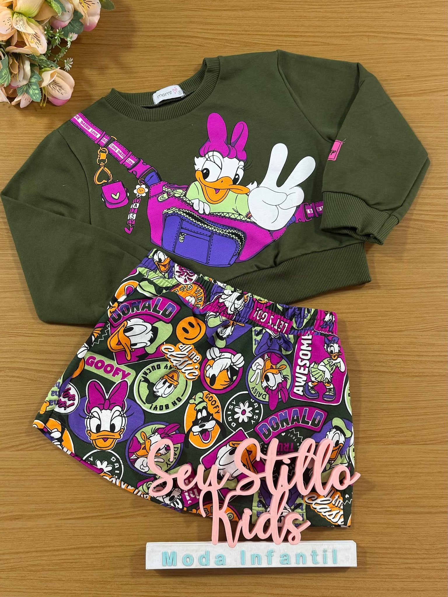 Conjunto Infantil Momi Inverno Shorts Saia e Moletom Sem Flanela Margarida Disney