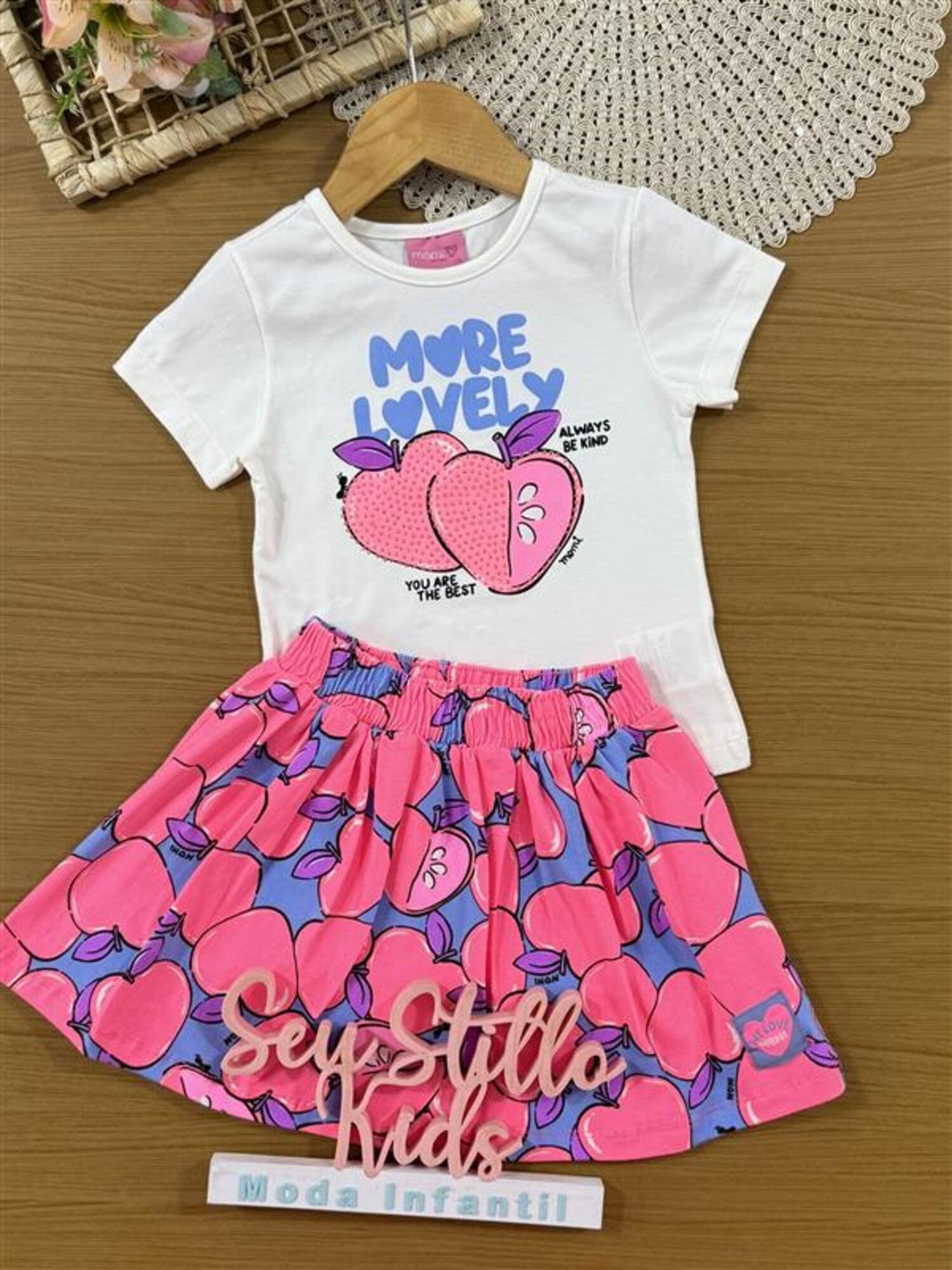 Conjunto Infantil Momi Verão com Saia Azul e Blusa Branca Frutinha