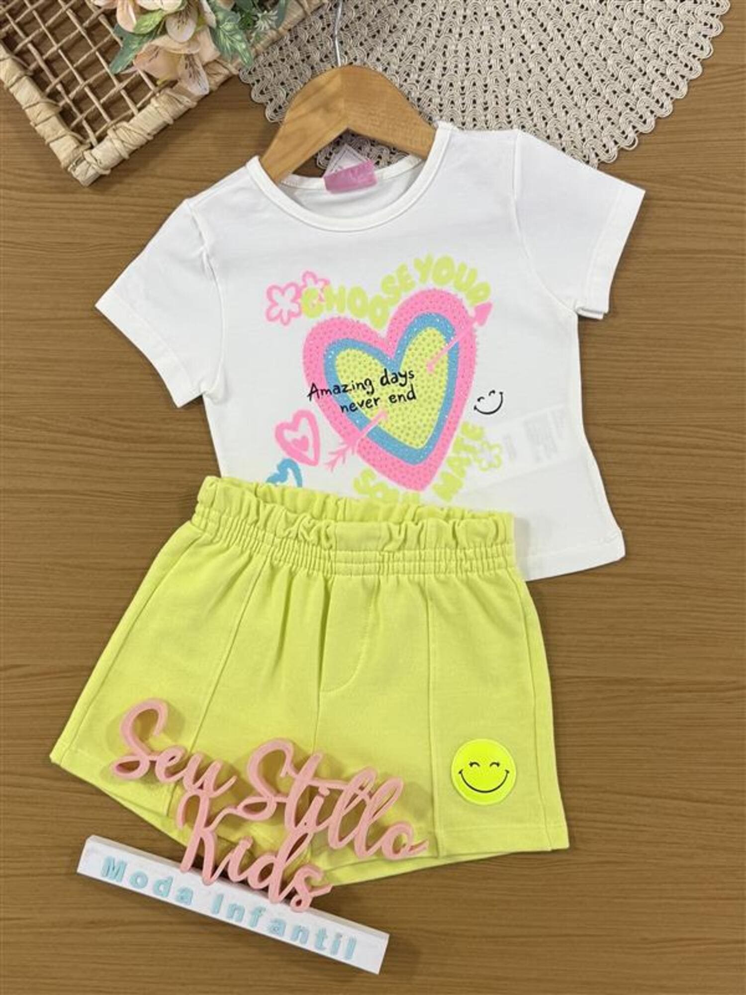Conjunto Infantil Momi Verão com Shorts Amarelo e Blusa Branca Coração com Strass