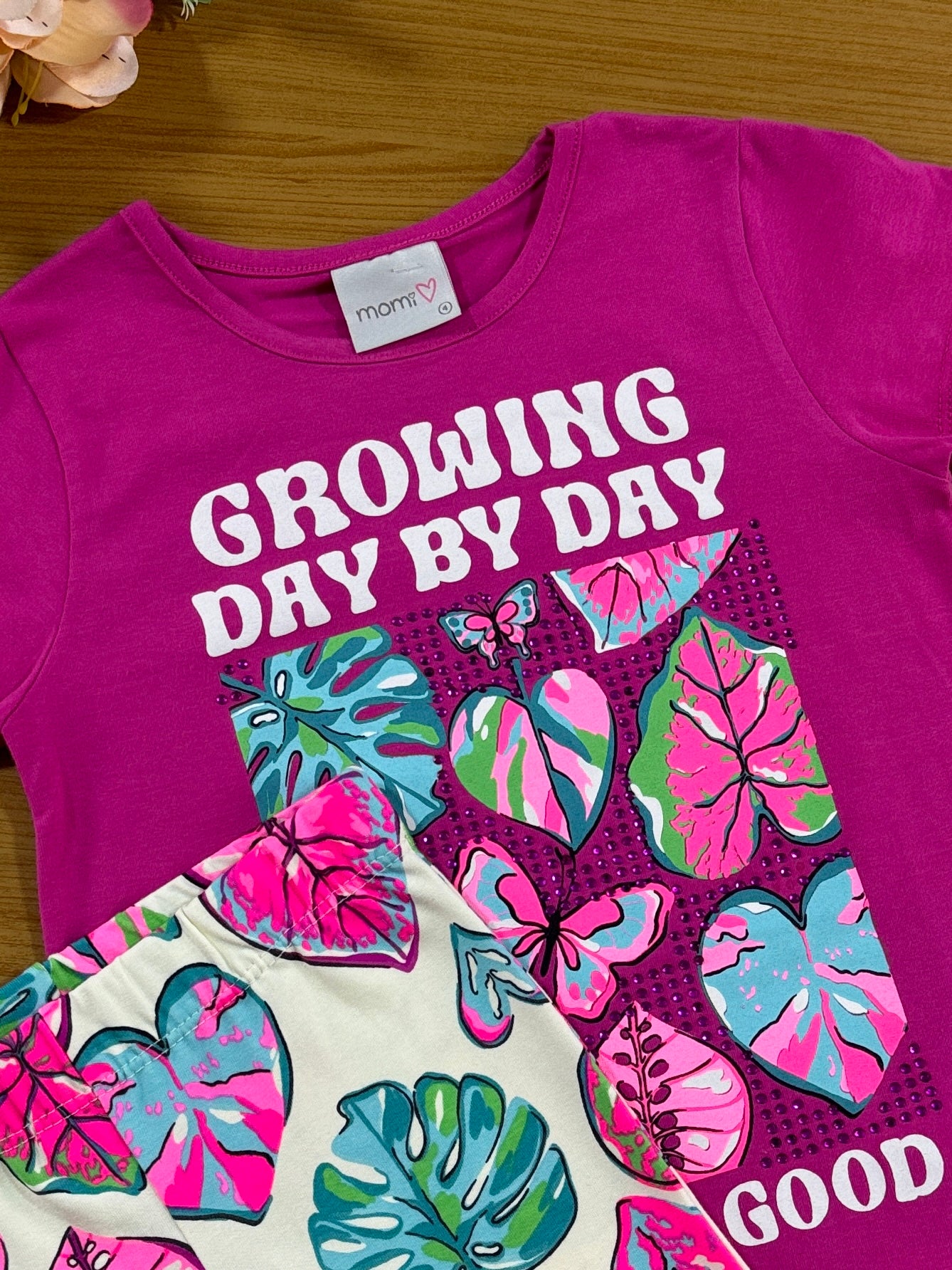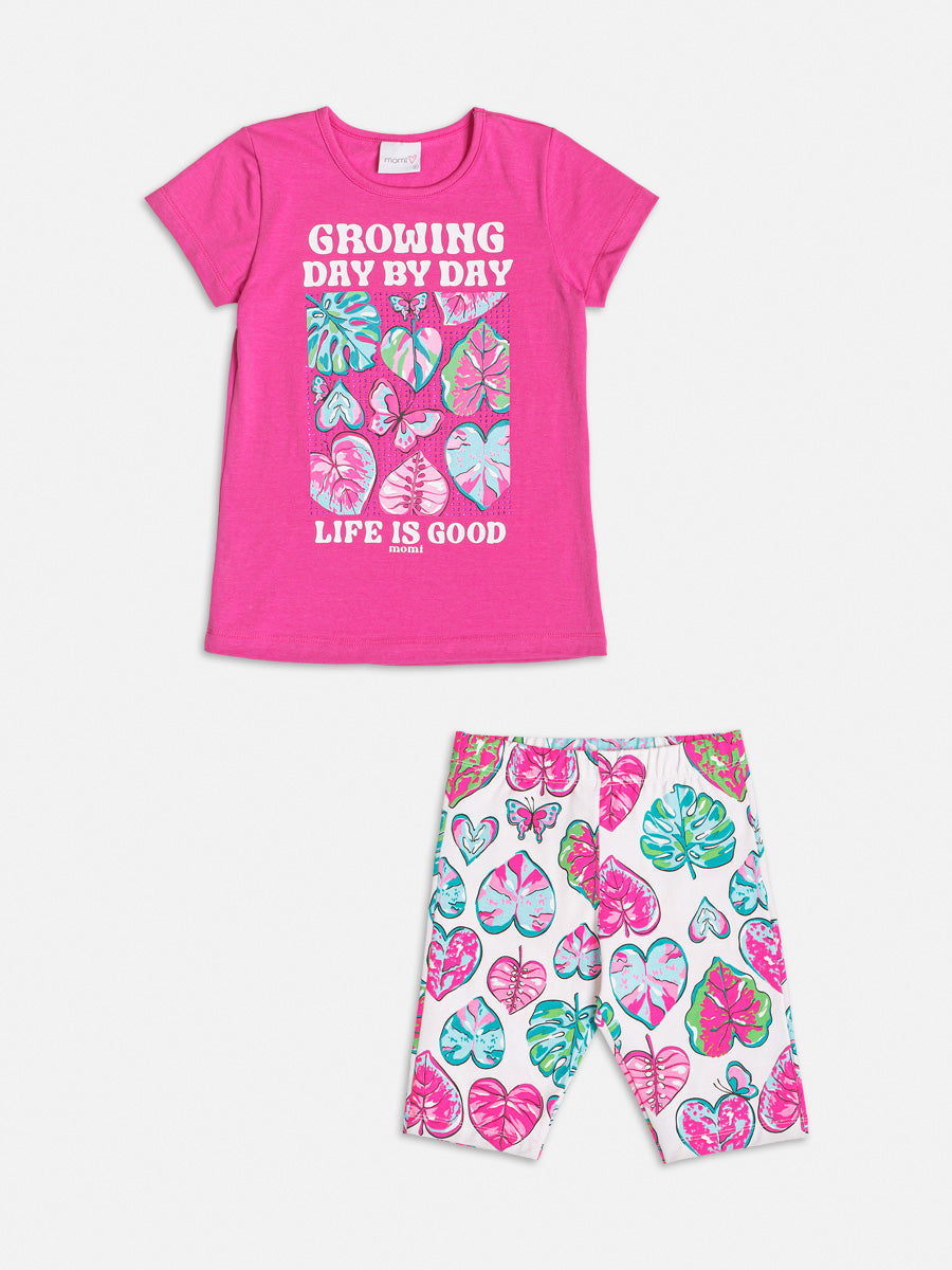 Conjunto Infantil Momi Verão Com Shorts Ciclista e Blusa Rosa Folhas