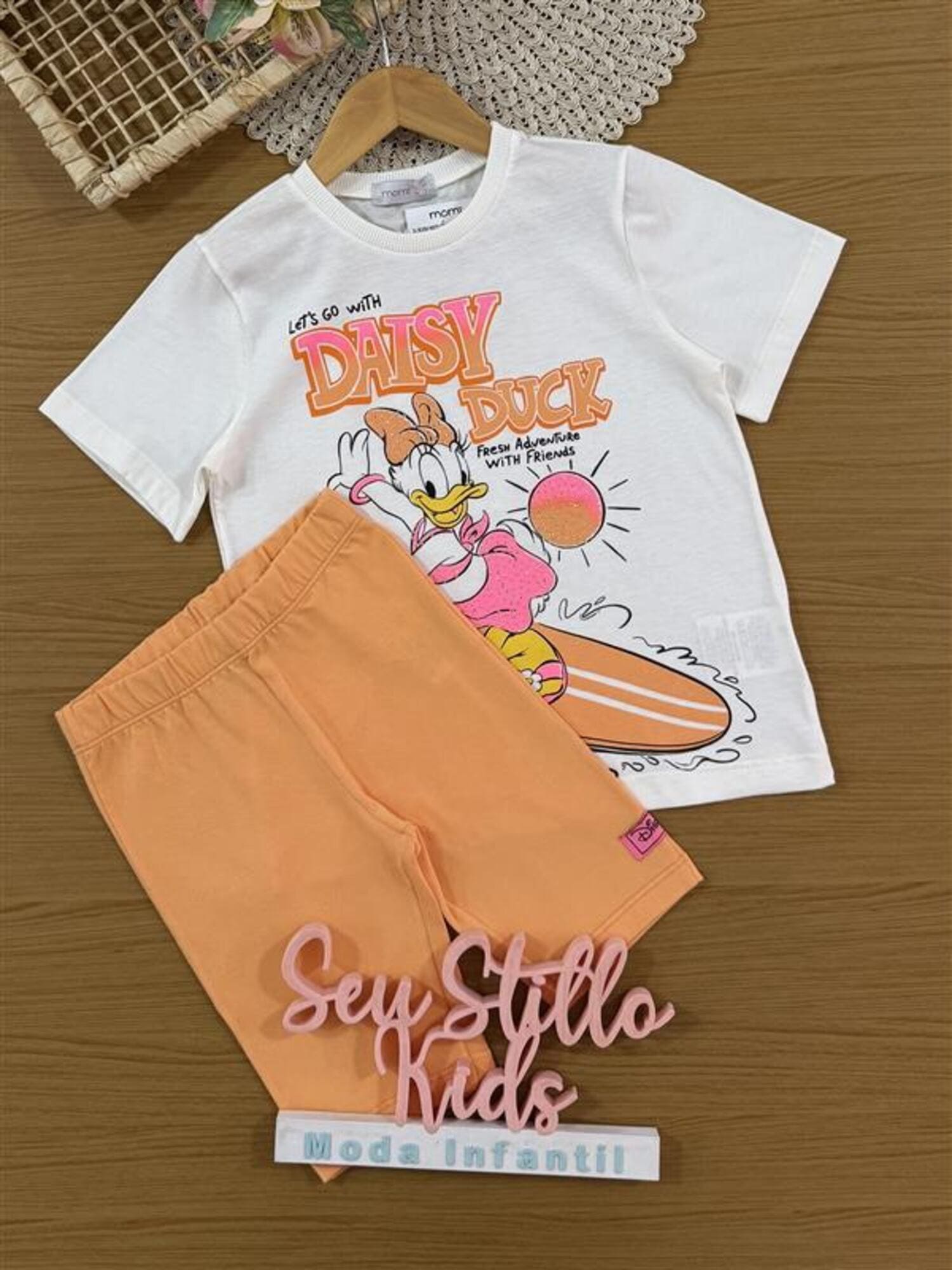 Conjunto Infantil Momi Verão com Shorts Ciclista Laranja e Blusa Branca Daisy Duck Disney