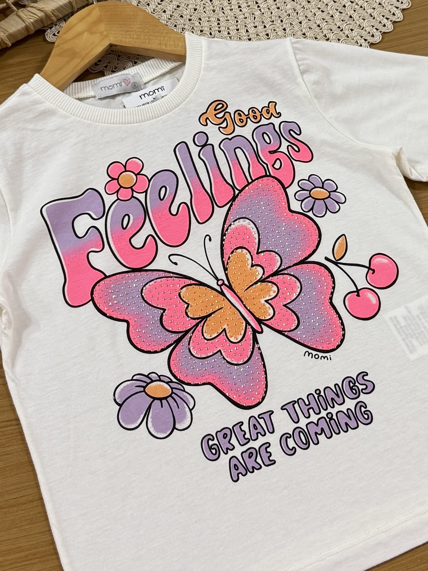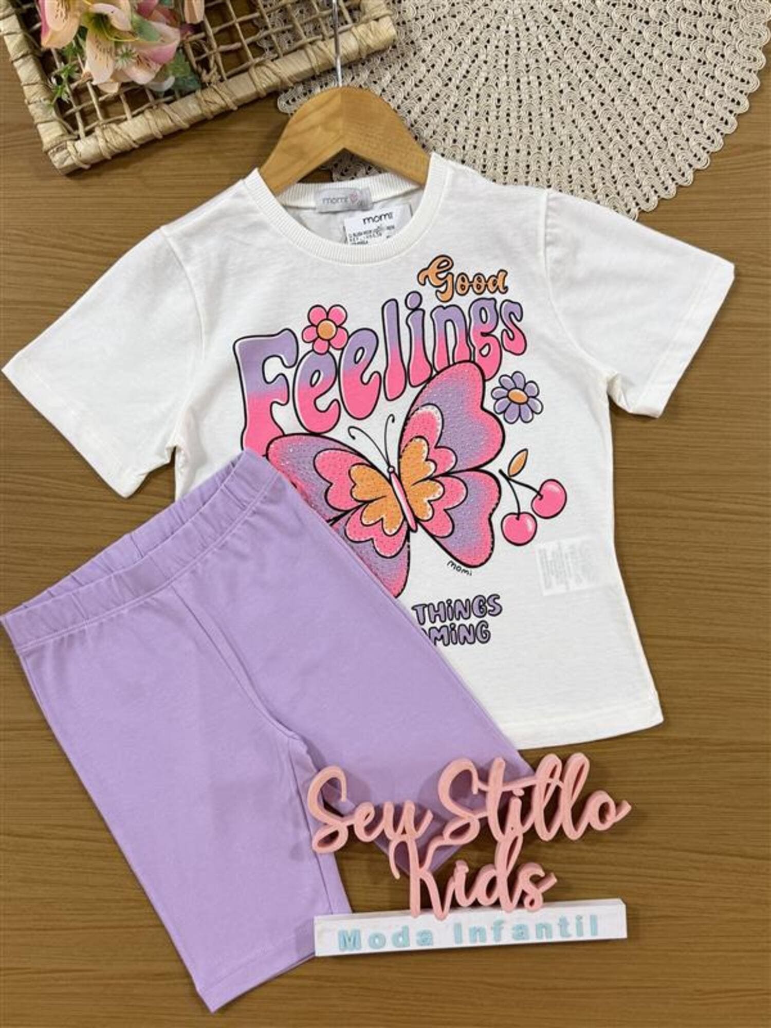 Conjunto Infantil Momi Verão com Shorts Ciclista Lilás e Blusa Branca Borboleta