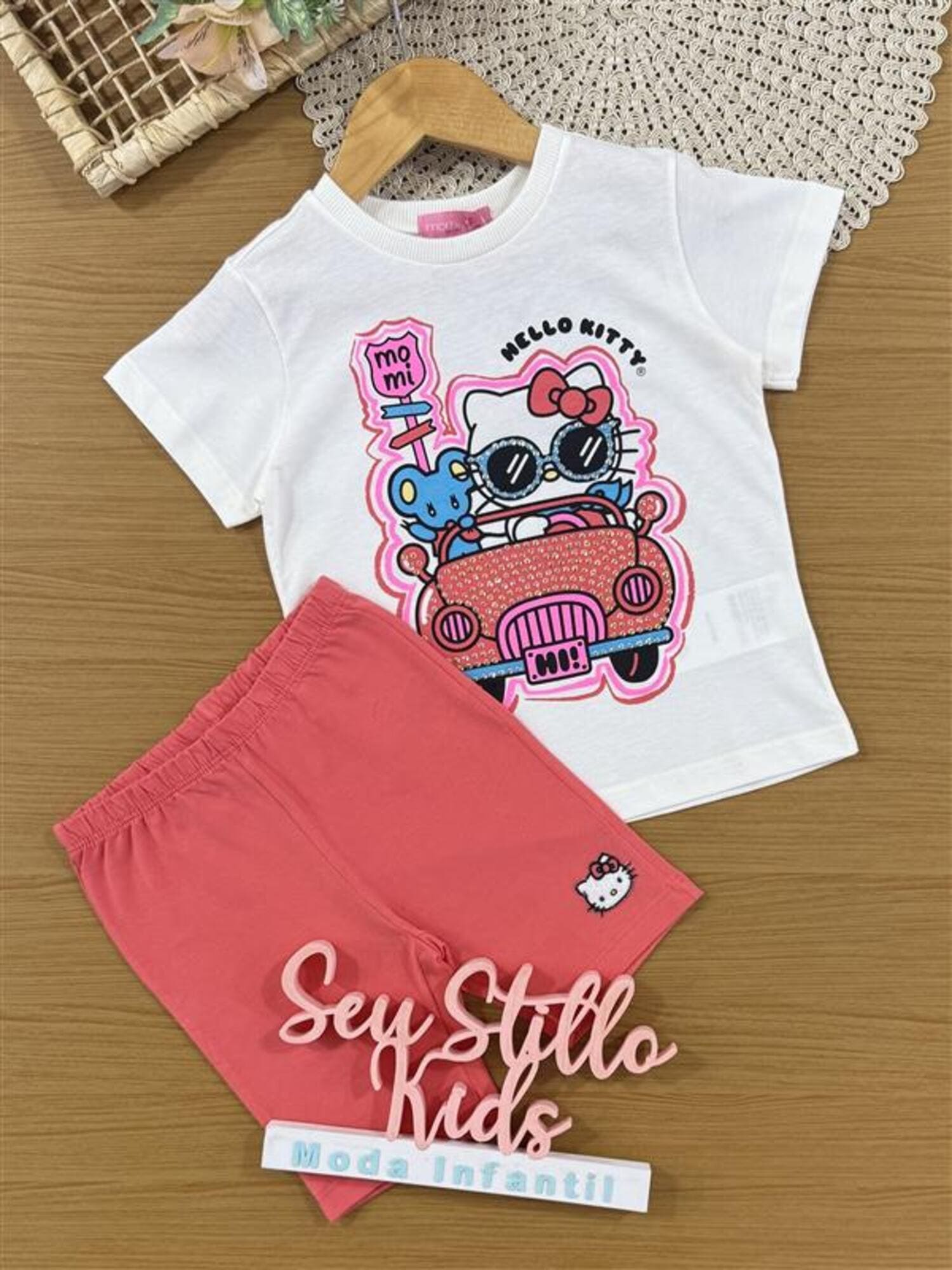 Conjunto Infantil Momi Verão com Shorts Ciclista Vermelho e Blusa Branca Hello Kitty Viagem