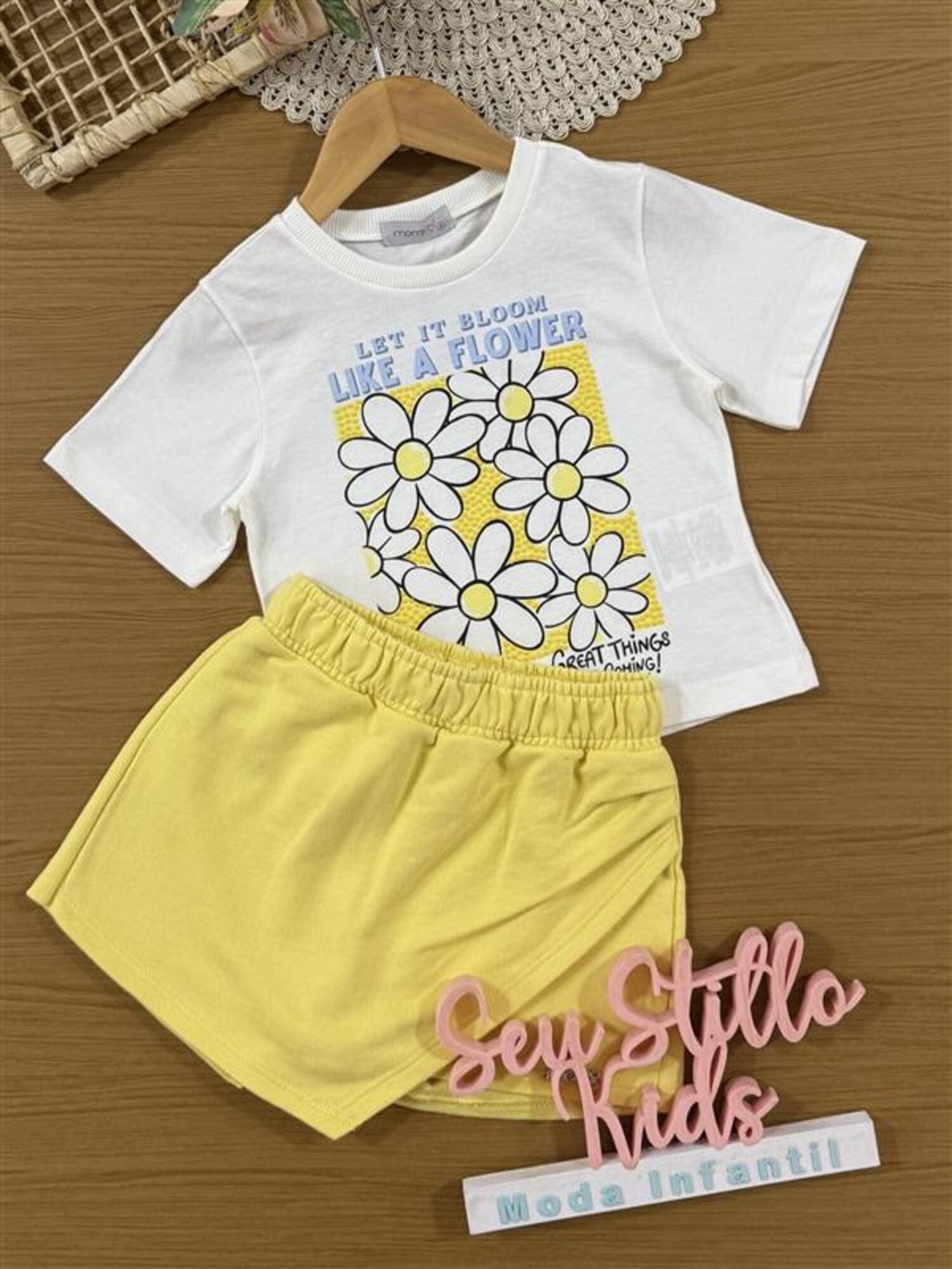 Conjunto Infantil Momi Verão com Shorts Saia Amarelo e Blusa Branca Floral