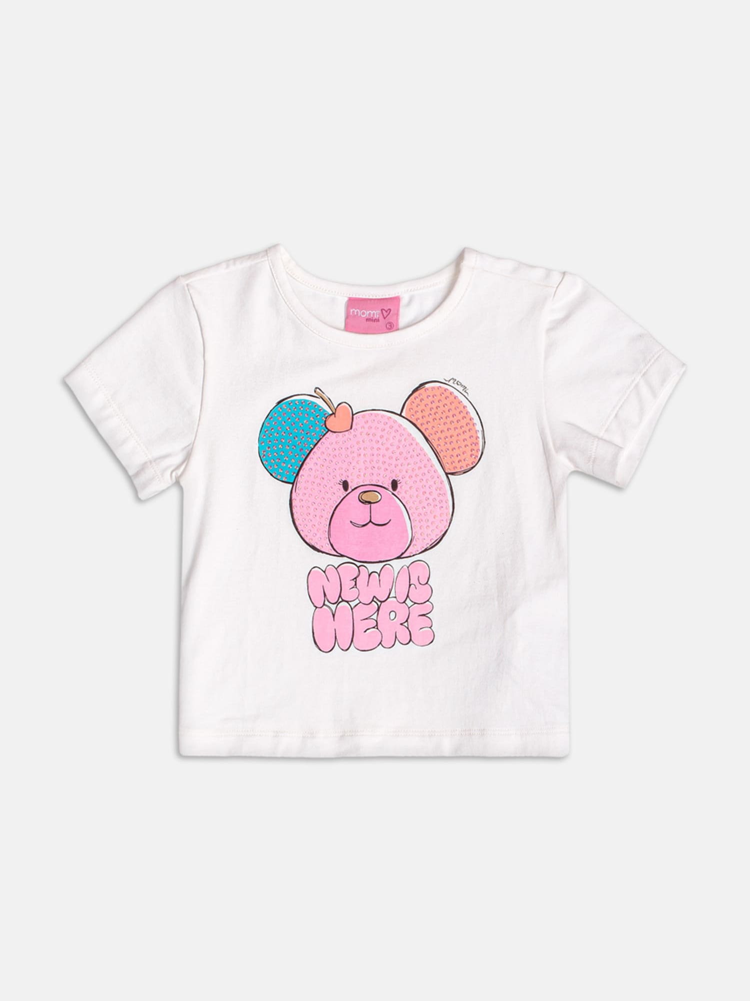 Conjunto Infantil Momi Verão com Shorts Saia Bege e Blusa Branca Ursinha com Strass