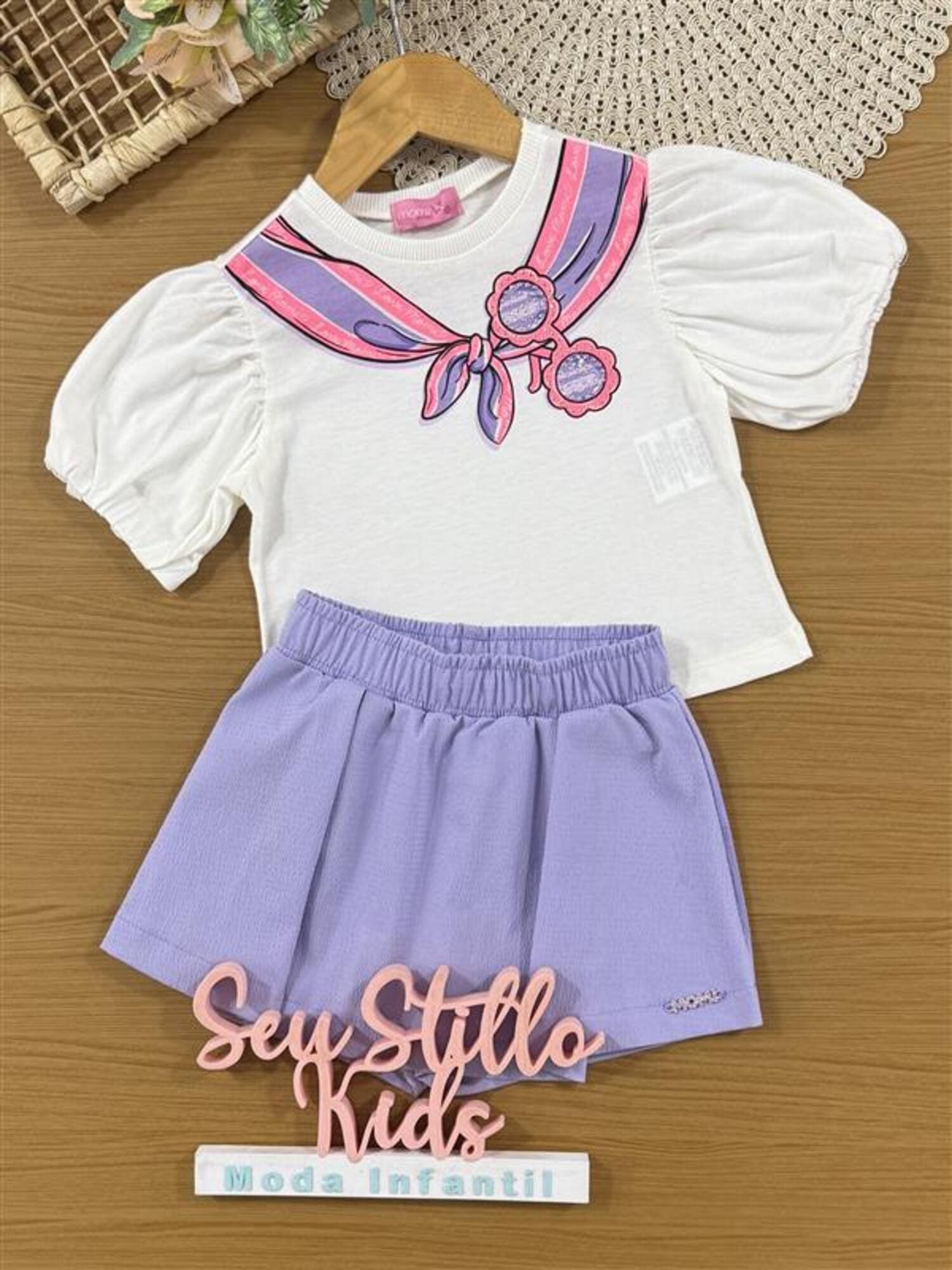 Conjunto Infantil Momi Verão com Shorts Saia Lilás e Blusa Branca Laço
