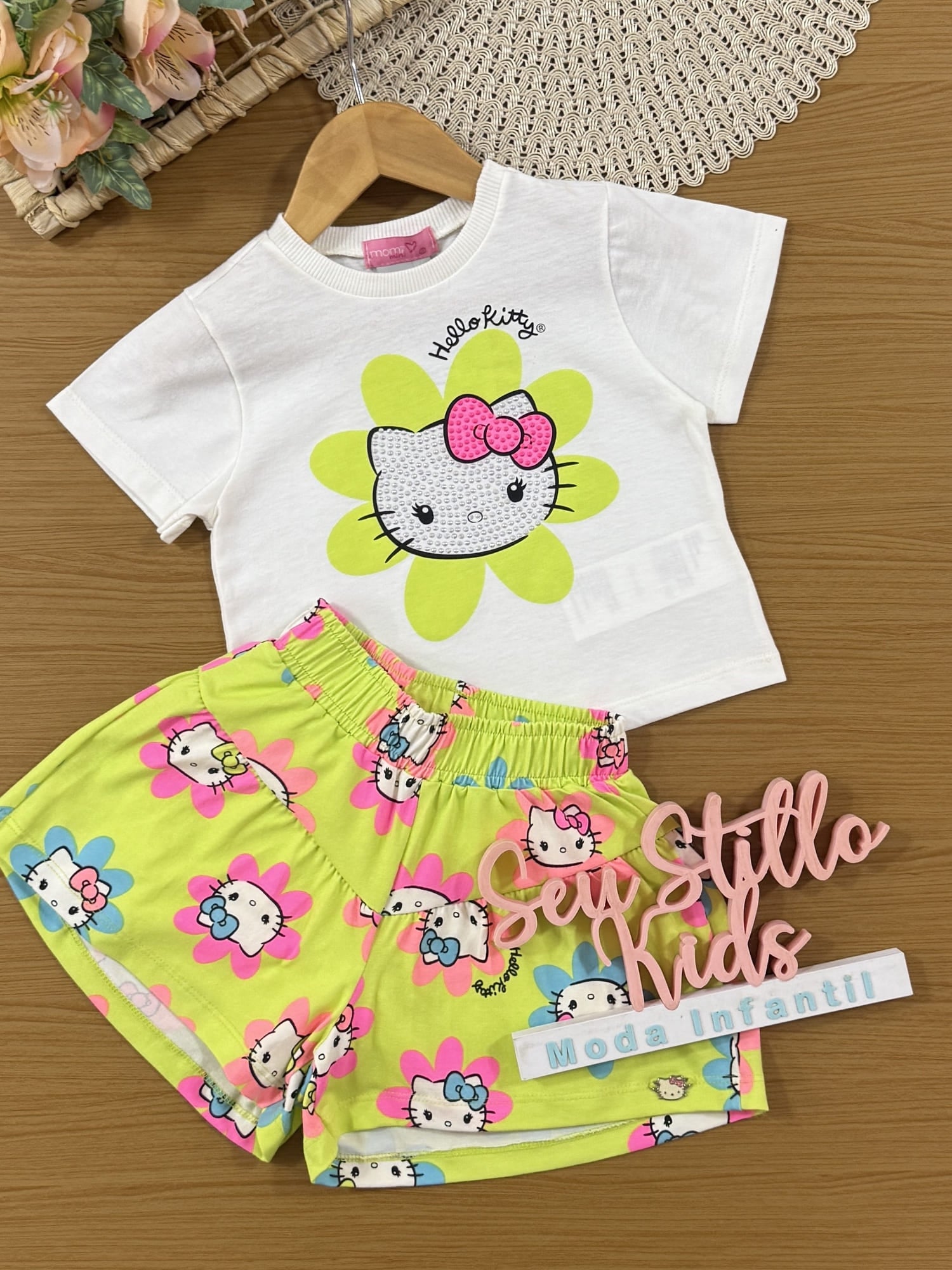 Conjunto Infantil Momi Verão com Shorts Verde e Blusa Branca Hello Kitty com Strass