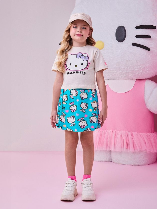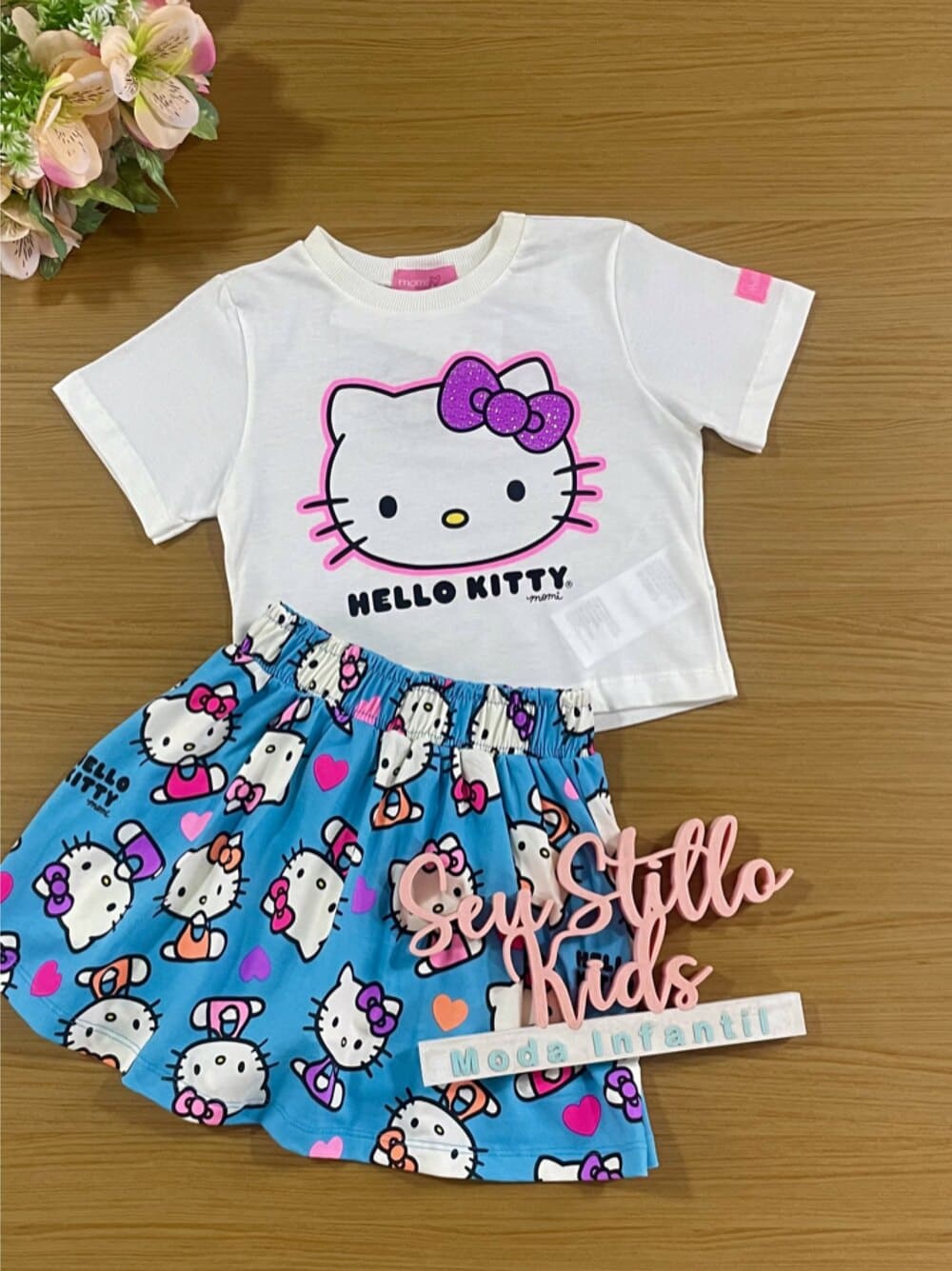 Conjunto Infantil Momi Verão Saia Azul e Blusa Off White Hello Kitty