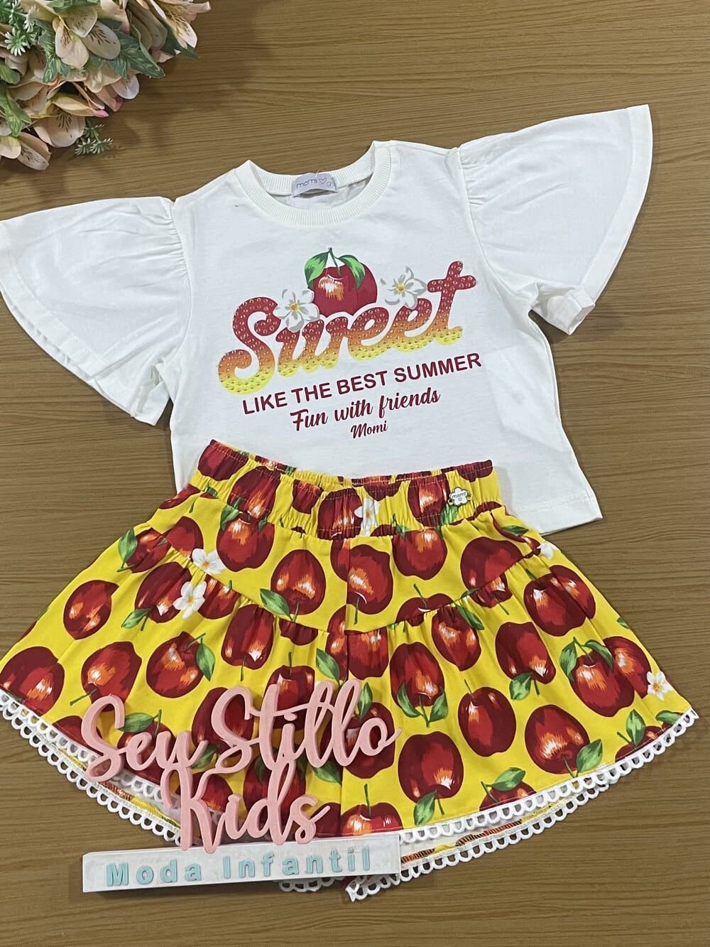 Conjunto Infantil Momi Verão Shorts Amarelo e Blusa Maçãzinha