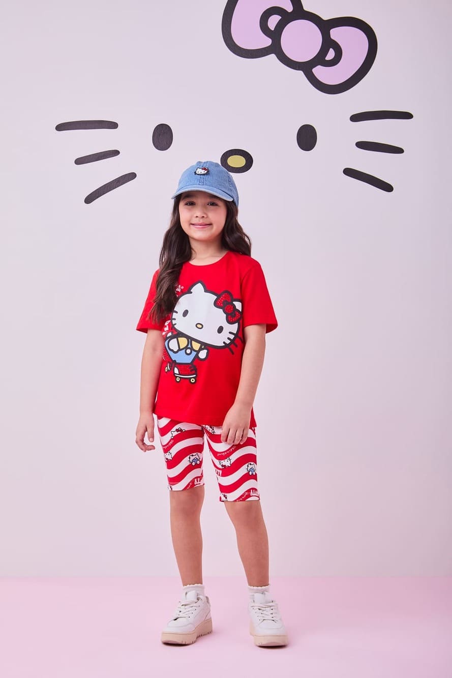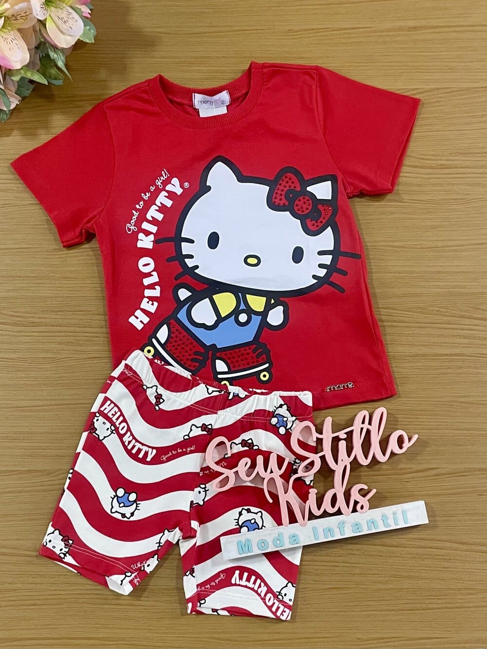 Conjunto Infantil Momi Verão Shorts Ciclista e Blusa Vermelha Hello Kitty