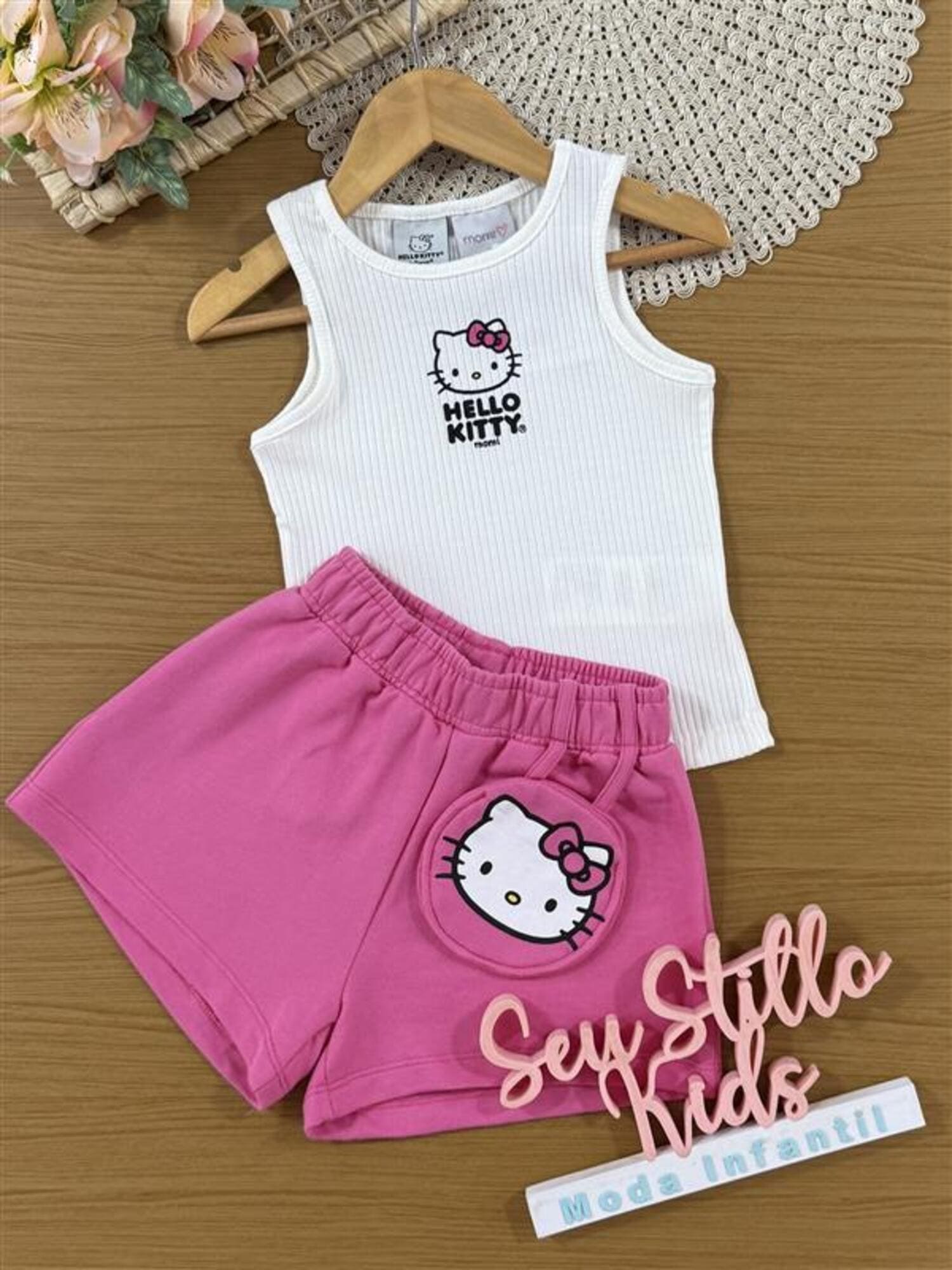 Conjunto Infantil Momi Verão Shorts com Bolsinha Rosa e Regata Branca Hello Kitty