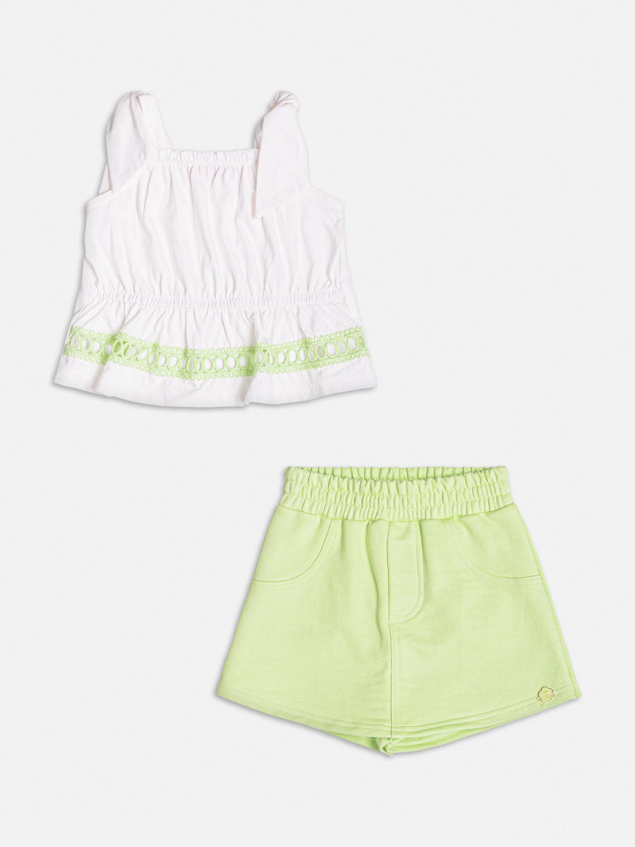 Conjunto Infantil Momi Verão Shorts Saia Verde e Blusa Off Bordada
