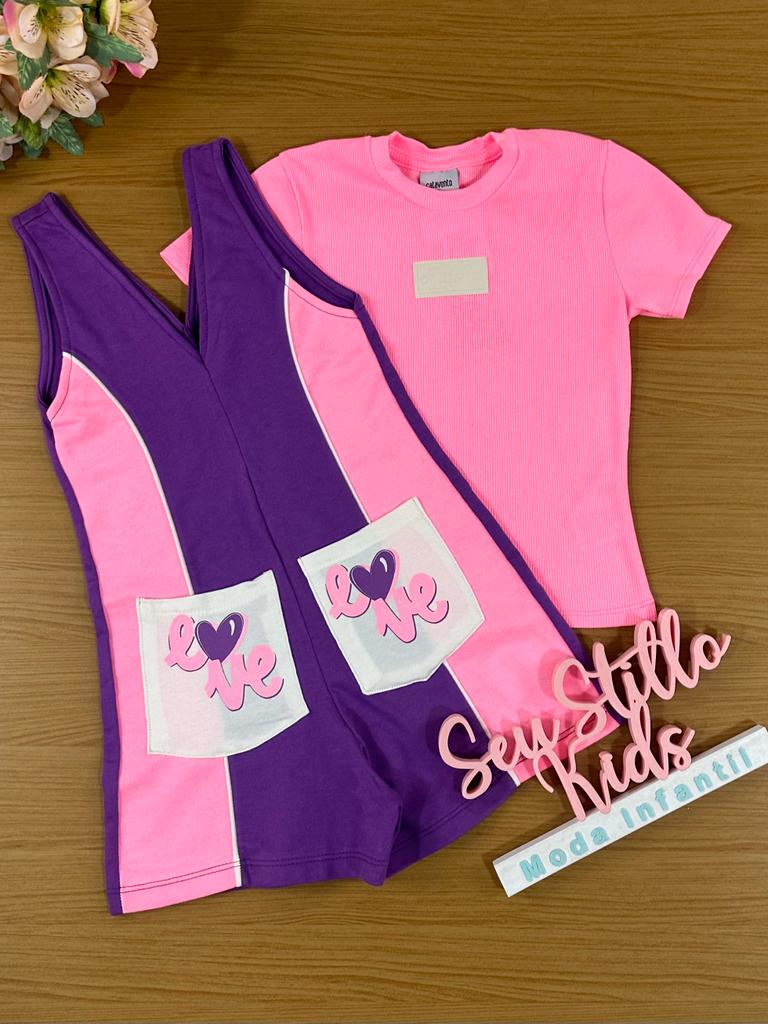 Jardineira Infantil Catavento Verão Com Blusa Rosa Love