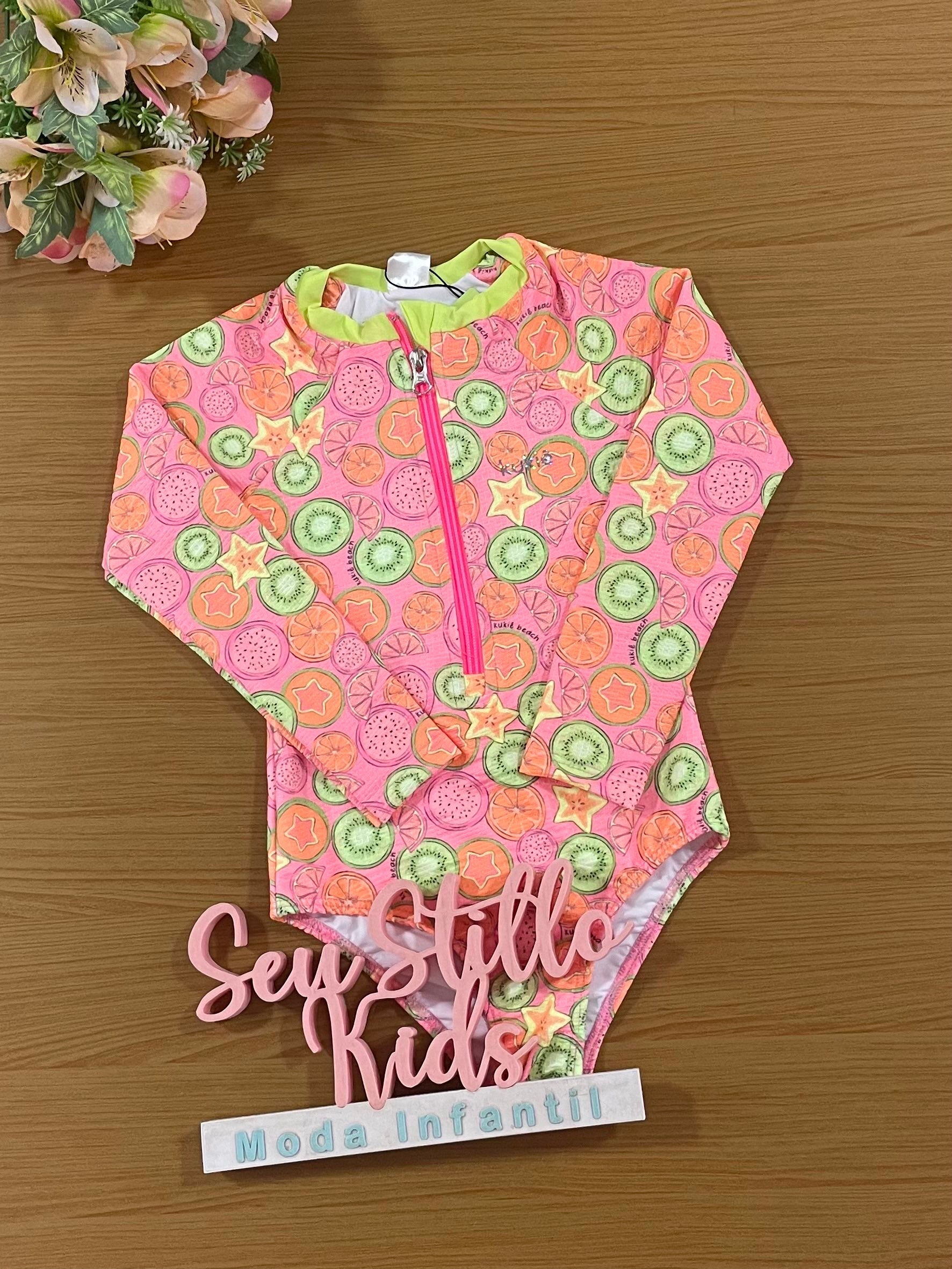Maiô Infantil Kukie Verão Manga Longa Rosa Frutinhas