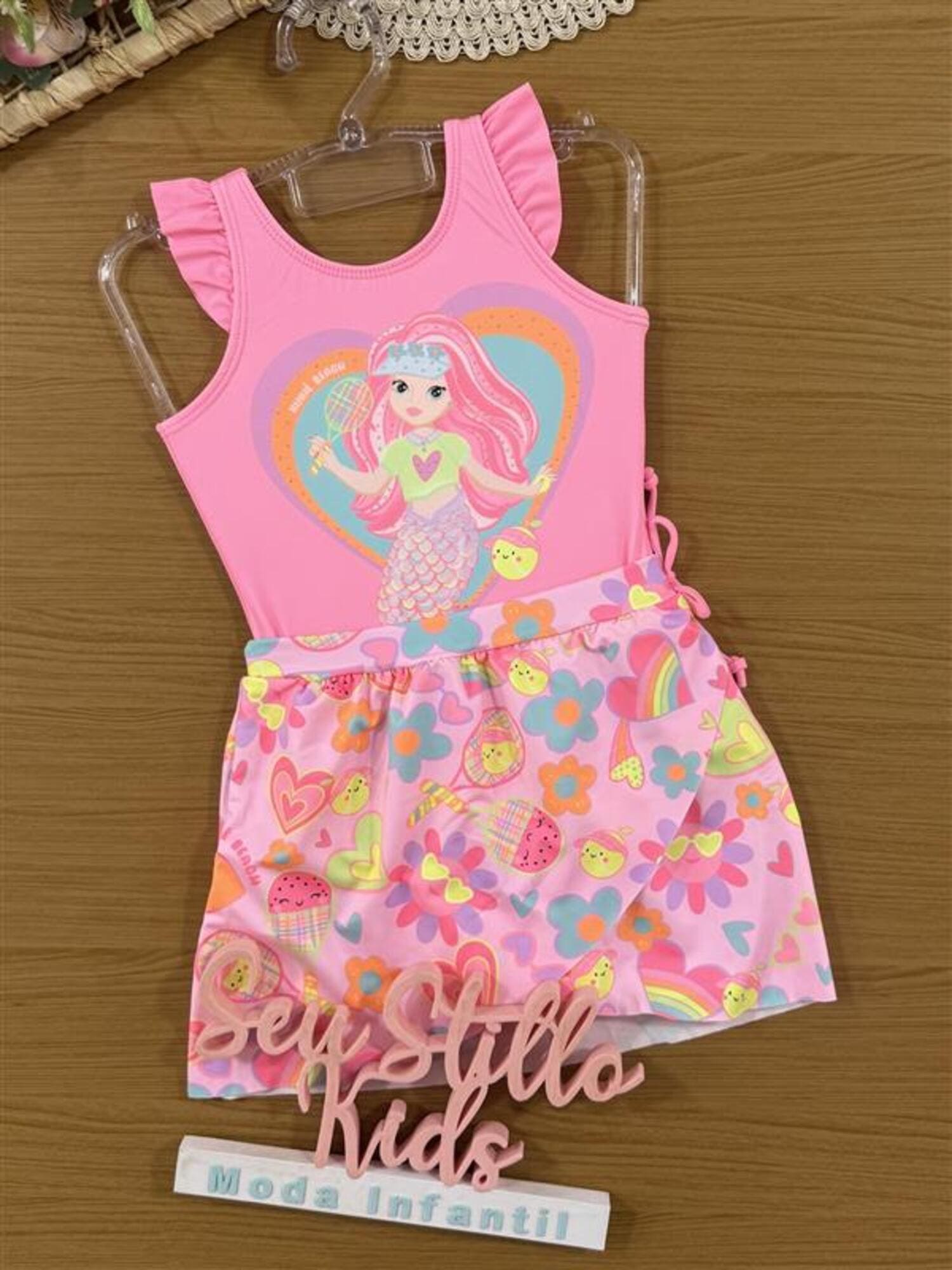Maiô Infantil Kukiê Verão Rosa Sereia Tênista com Saida de Praia Estampada
