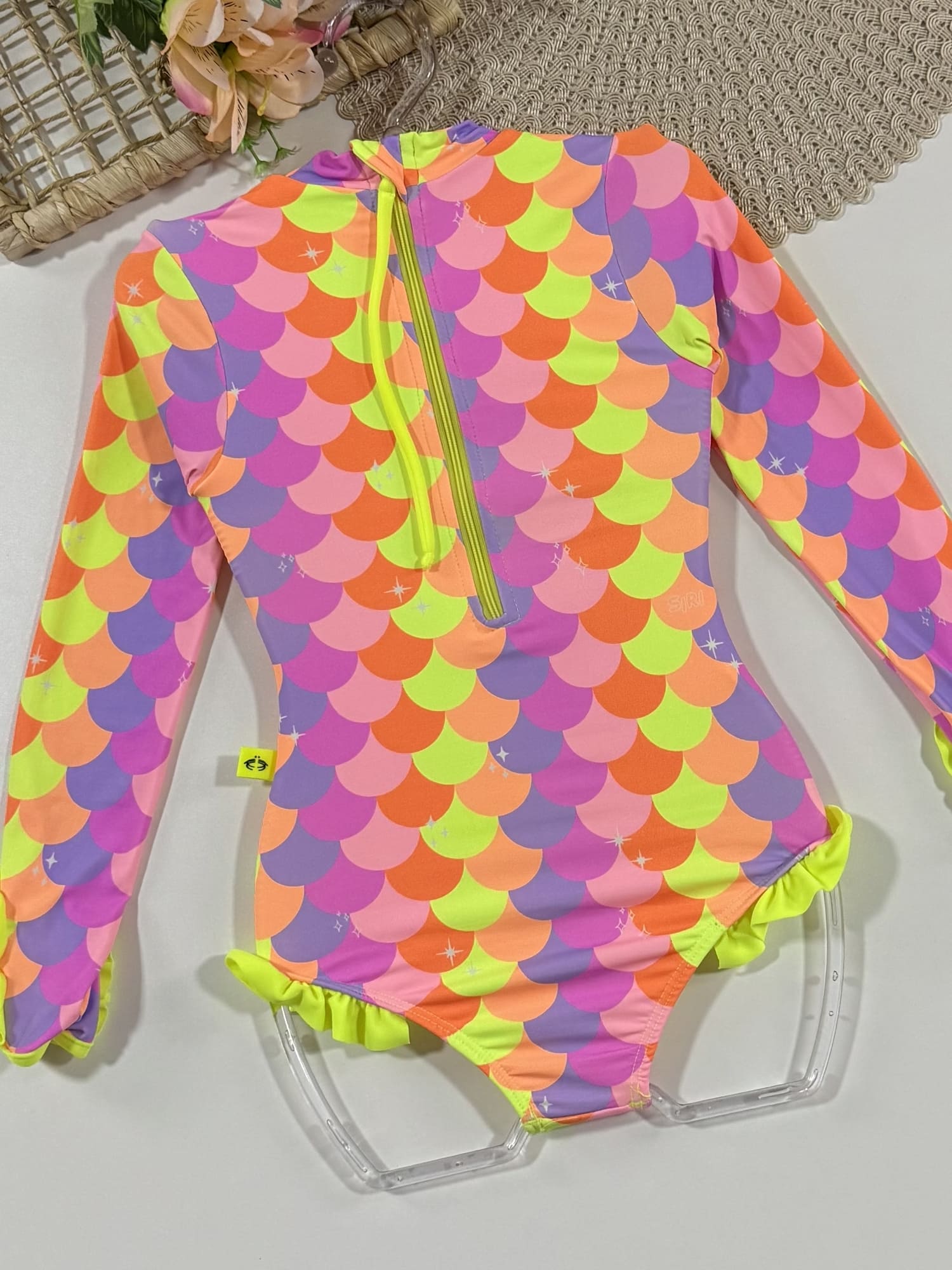 Pode ocorrer um leve desbotamento na primeira lavagem, devido às cores fluorescentes. Siga corretamente as orientações da etiqueta interna do Maiô Infantil Siri Kids.