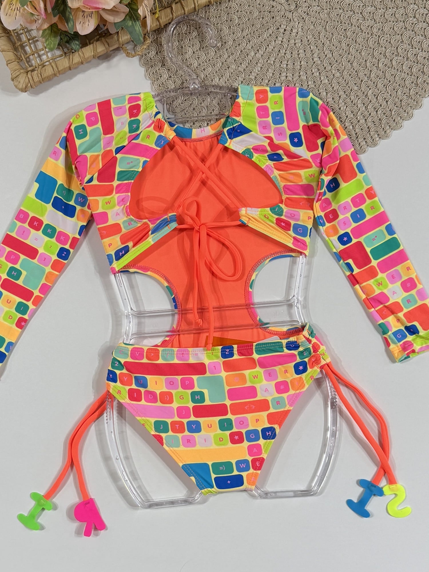 Pode ocorrer um leve desbotamento na primeira lavagem, devido às cores fluorescentes. Siga corretamente as orientações da etiqueta interna do Maiô Infantil Siri Kids.