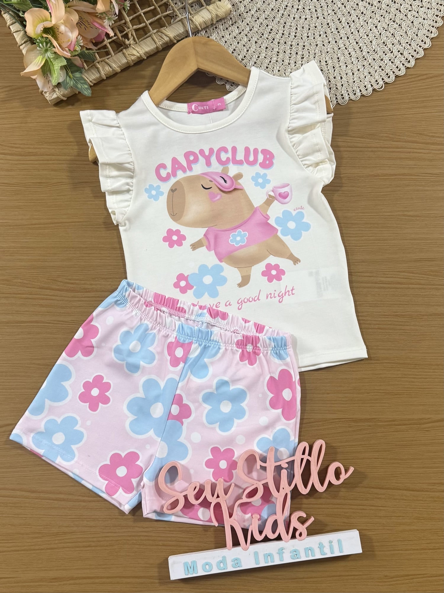 Pijama Infantil Cinti Verão com Shorts Rosa e Blusa Branca Capivara