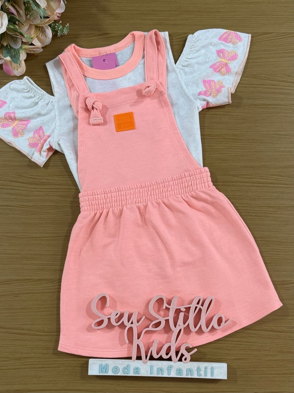 Salopete Infantil Cinti Verão Laranja Com Blusa Off White Borboletas