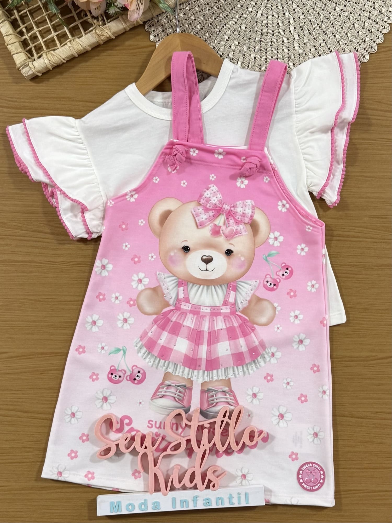 Salopete Infantil Cinti Verão Rosa com Blusa Branca Ursinha Floral