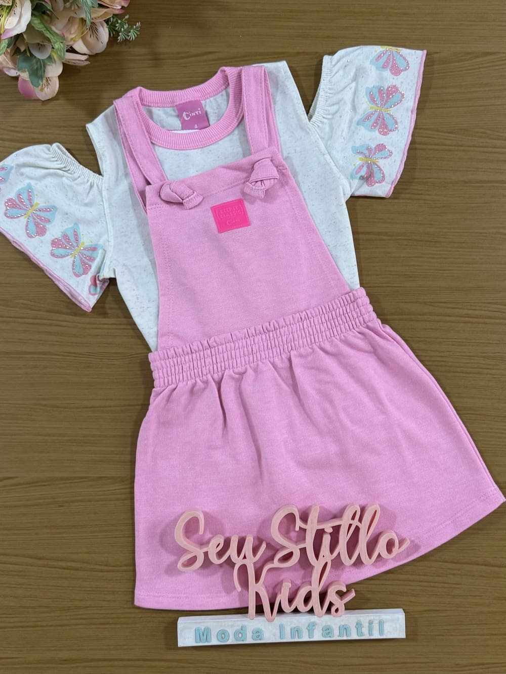 Salopete Infantil Cinti Verão Rosa Com Blusa Off White Borboletas