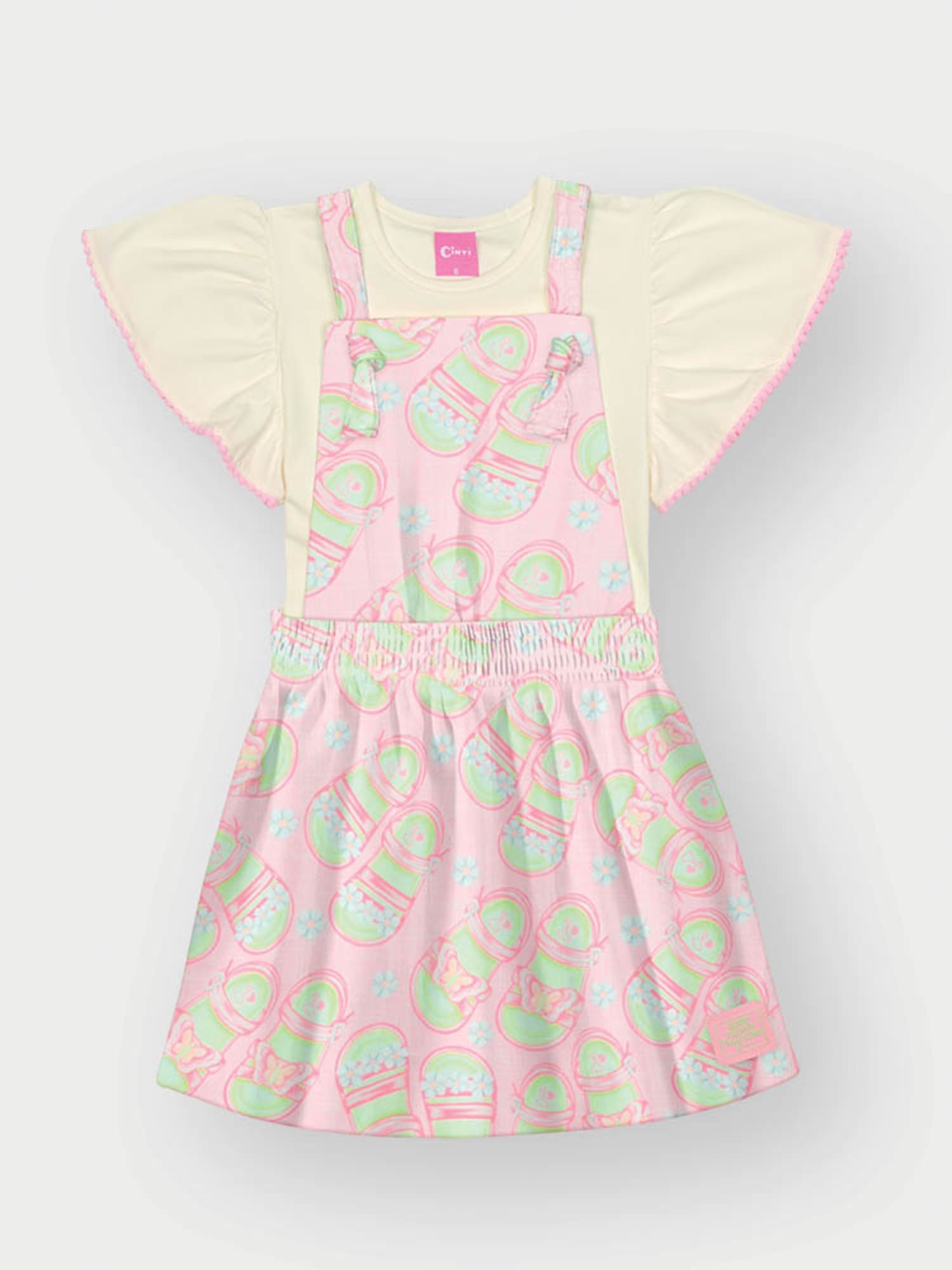 Salopete Infantil Cinti Verão Rosa Floral com Blusa Branca
