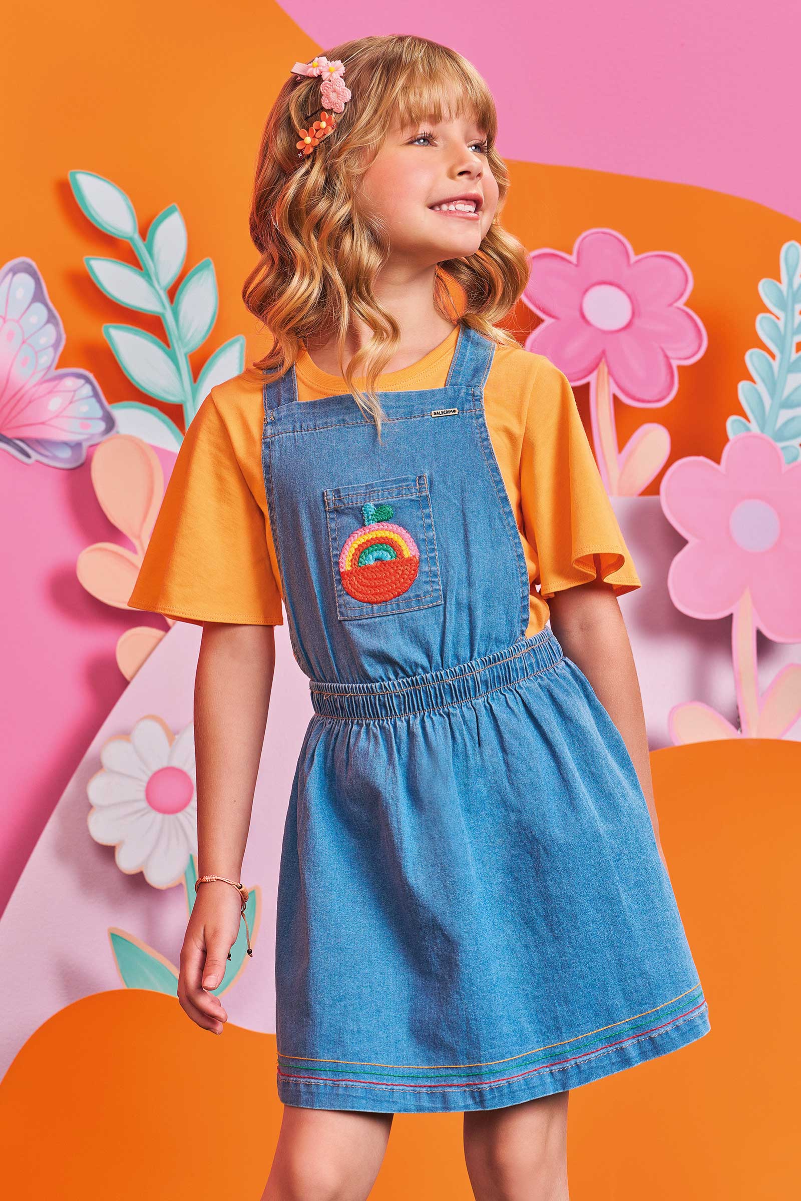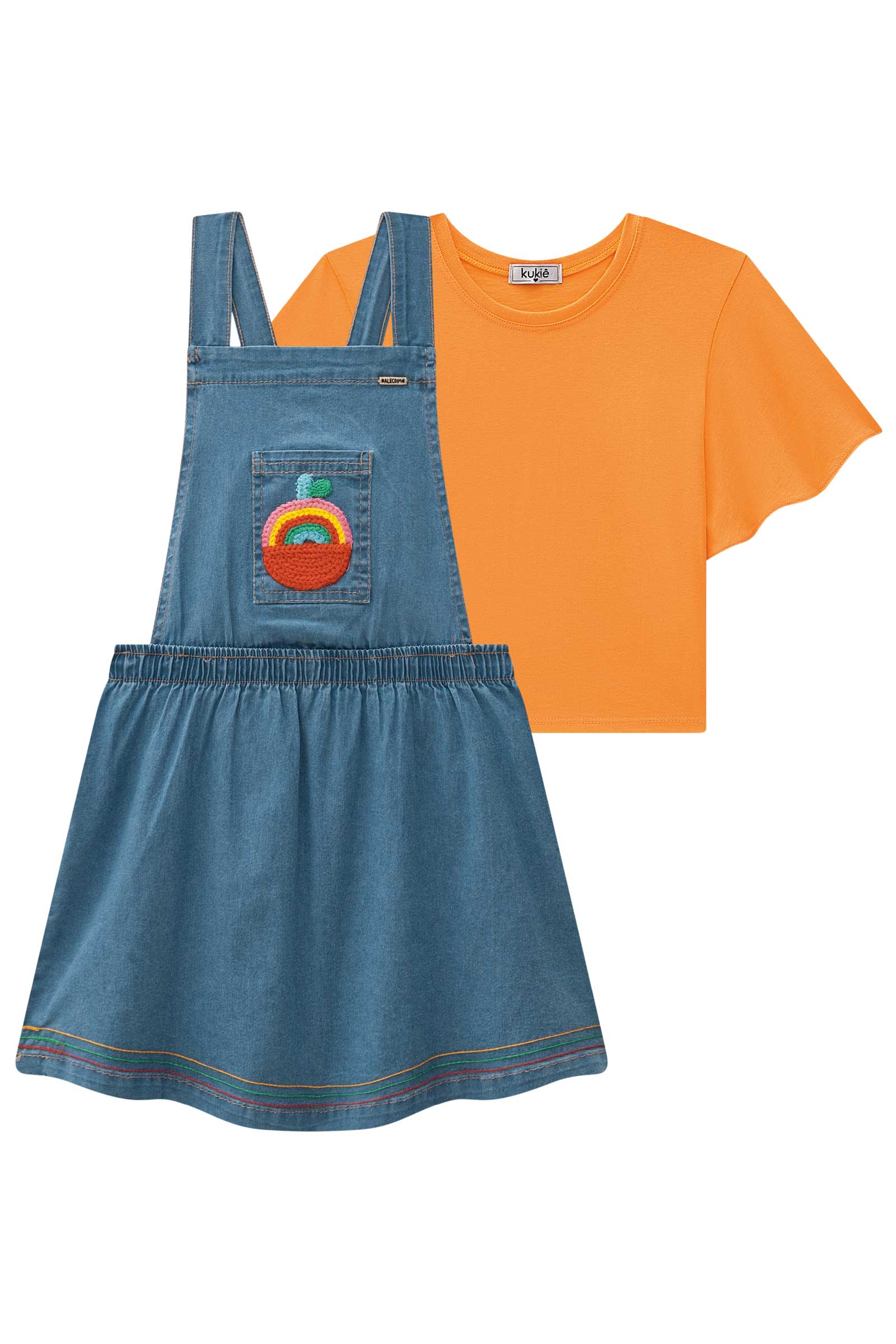 Salopete Infantil Kukie Alecrim Verão Jeans com Blusa Laranja