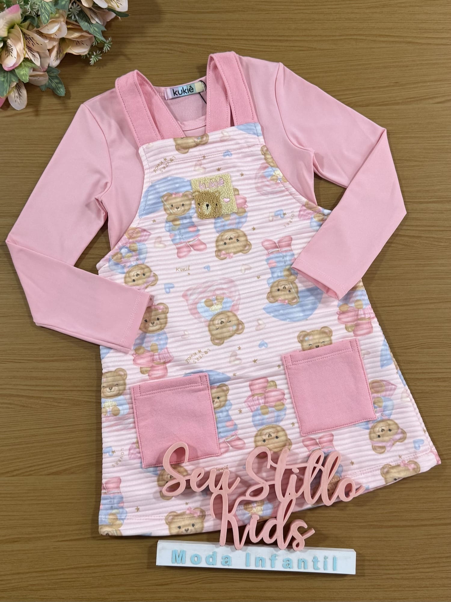 Salopete Infantil Kukiê Inverno com Blusa Térmica Rosa Ursinhos