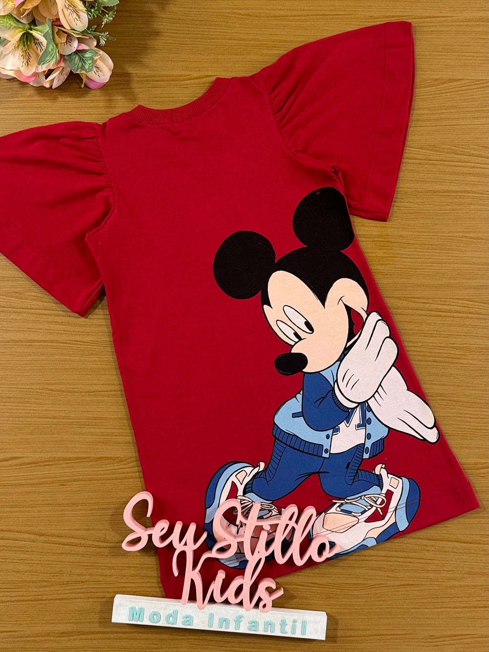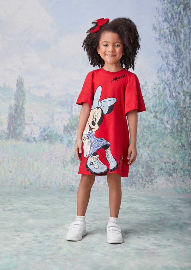 Vestido Infantil Animê com gola redonda, mangas curtas soltinhas, estampa frontal da minnie e nas costas mickey.