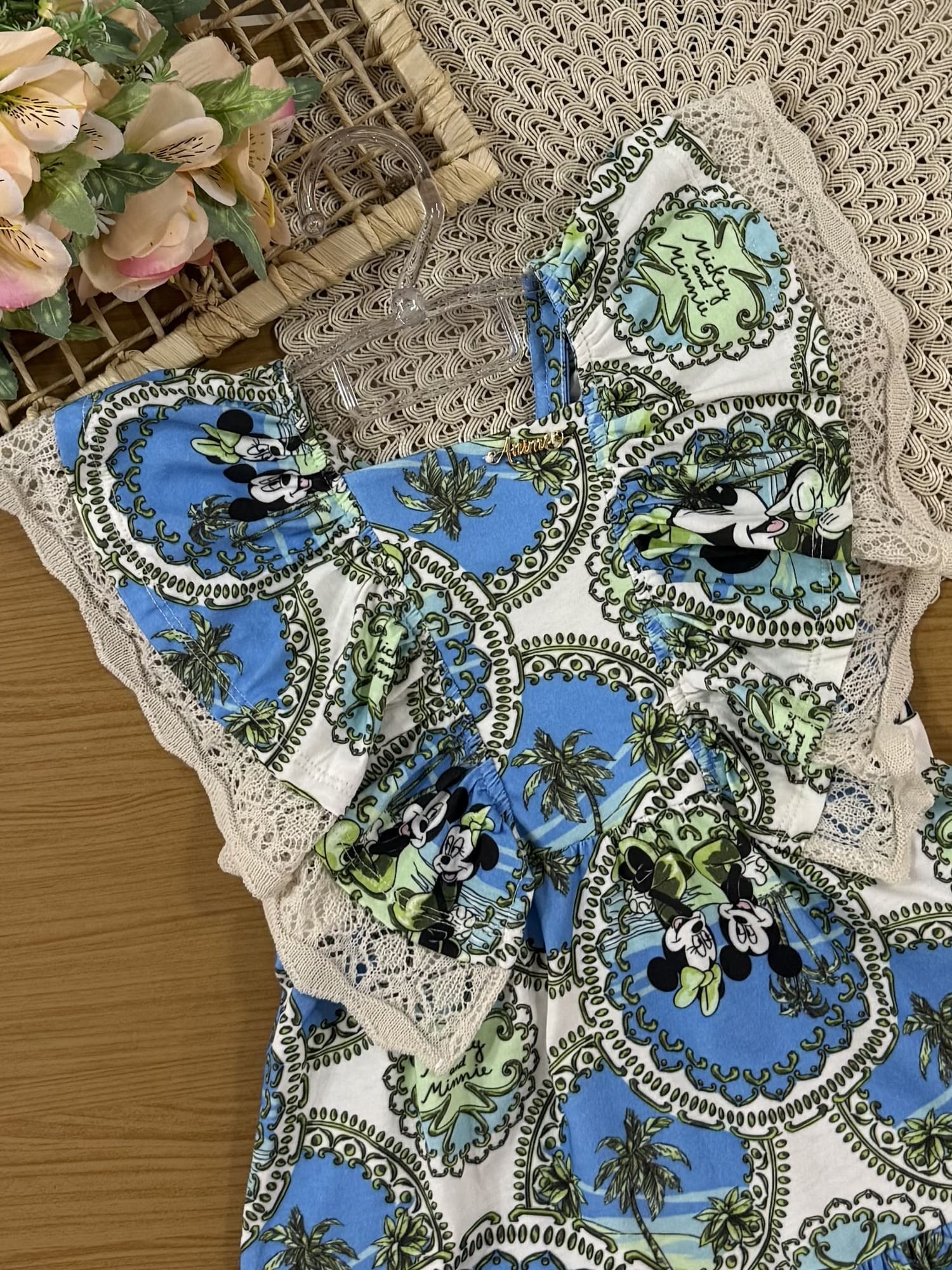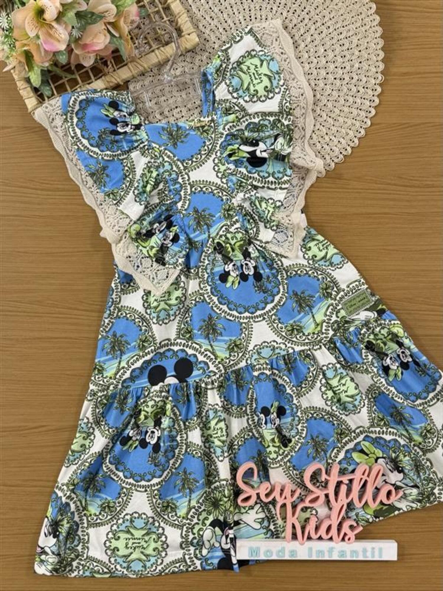 Vestido Infantil Animê Verão Estampado com Trico Minnie e Mickey Disney