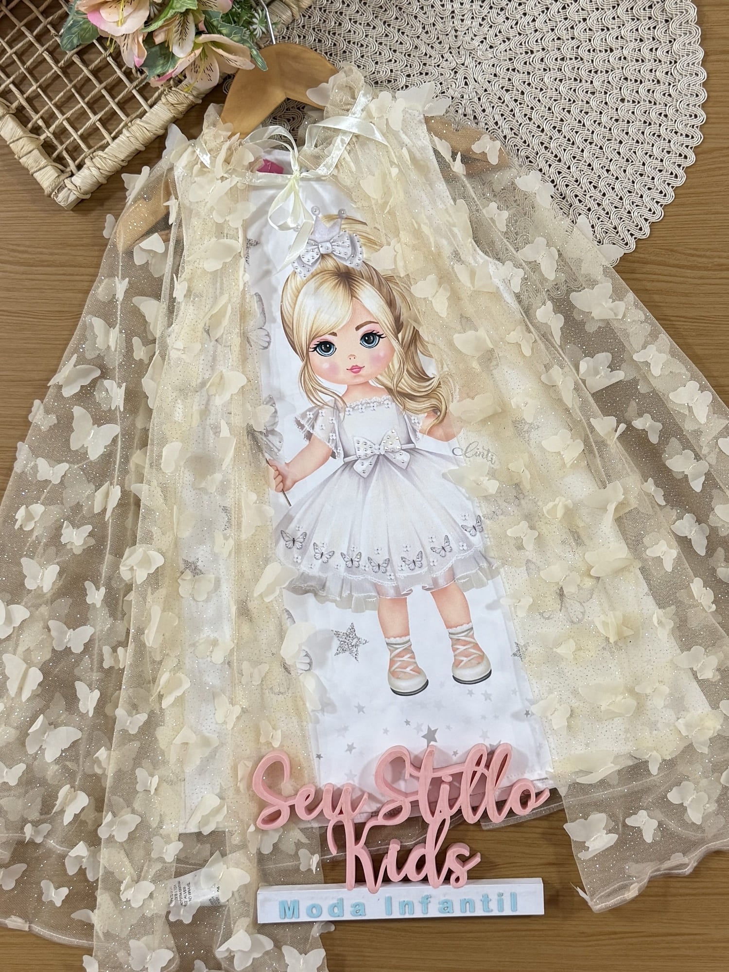 Vestido Infantil Cinti Verão Branco Princesinha com Sobreposição em Tule Borboletas