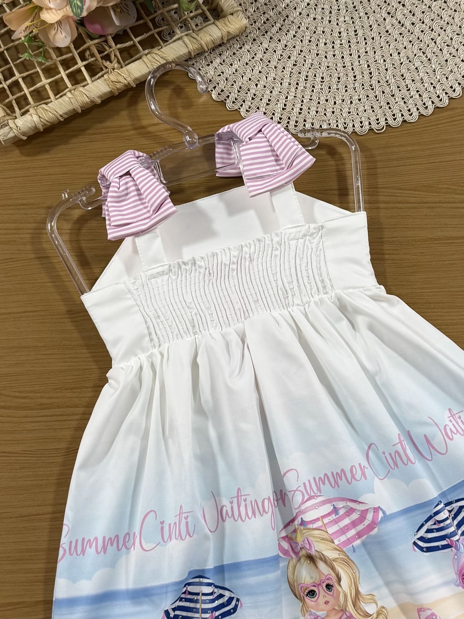 Vestido Infantil Cinti Verão Branco Unicórnio na Praia com Laço