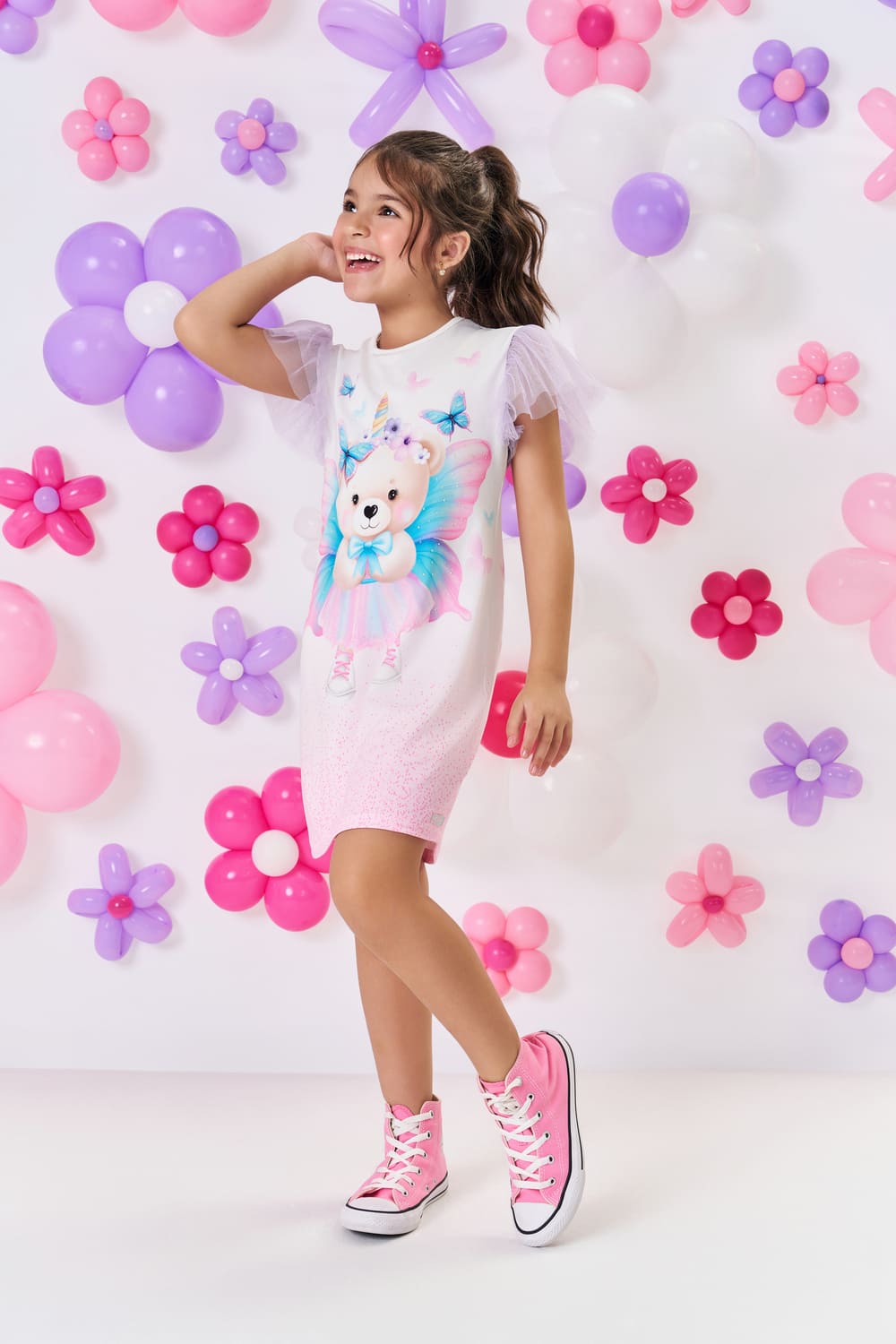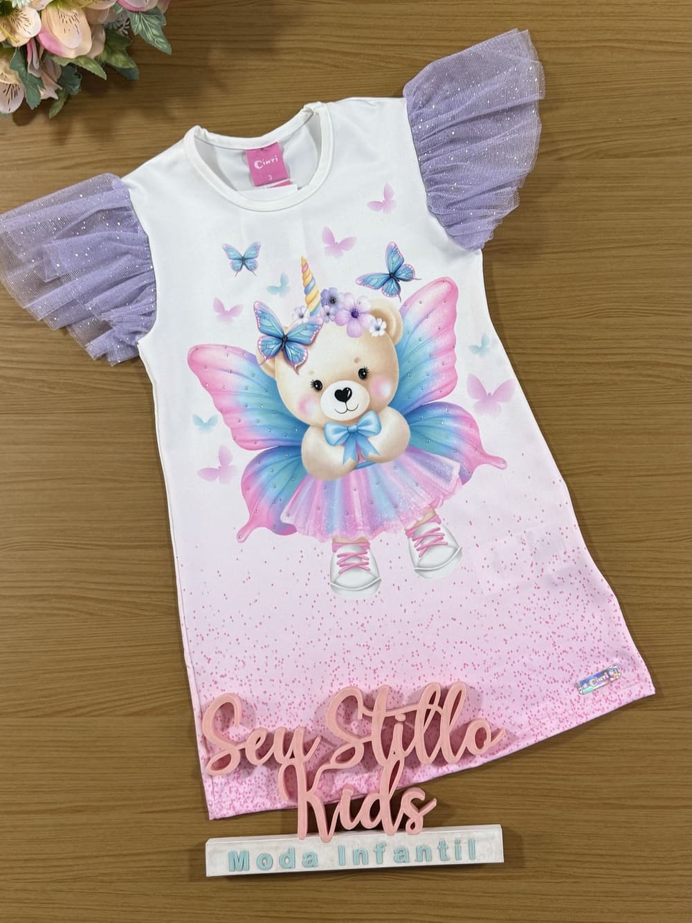 Vestido Infantil Cinti Verão Branco Ursinha Borboleta