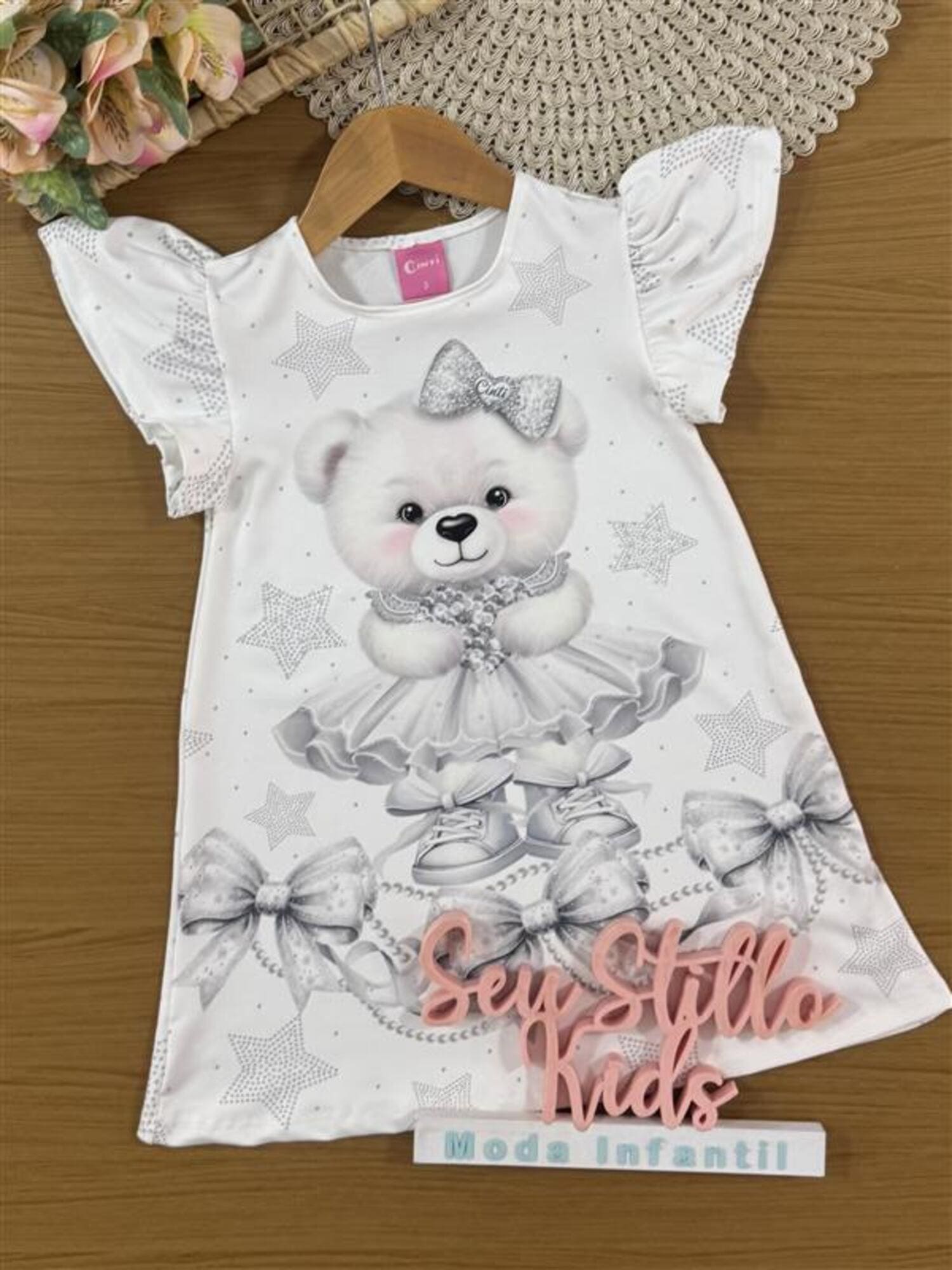 Vestido Infantil Cinti Verão Branco Ursinha Estrelinha