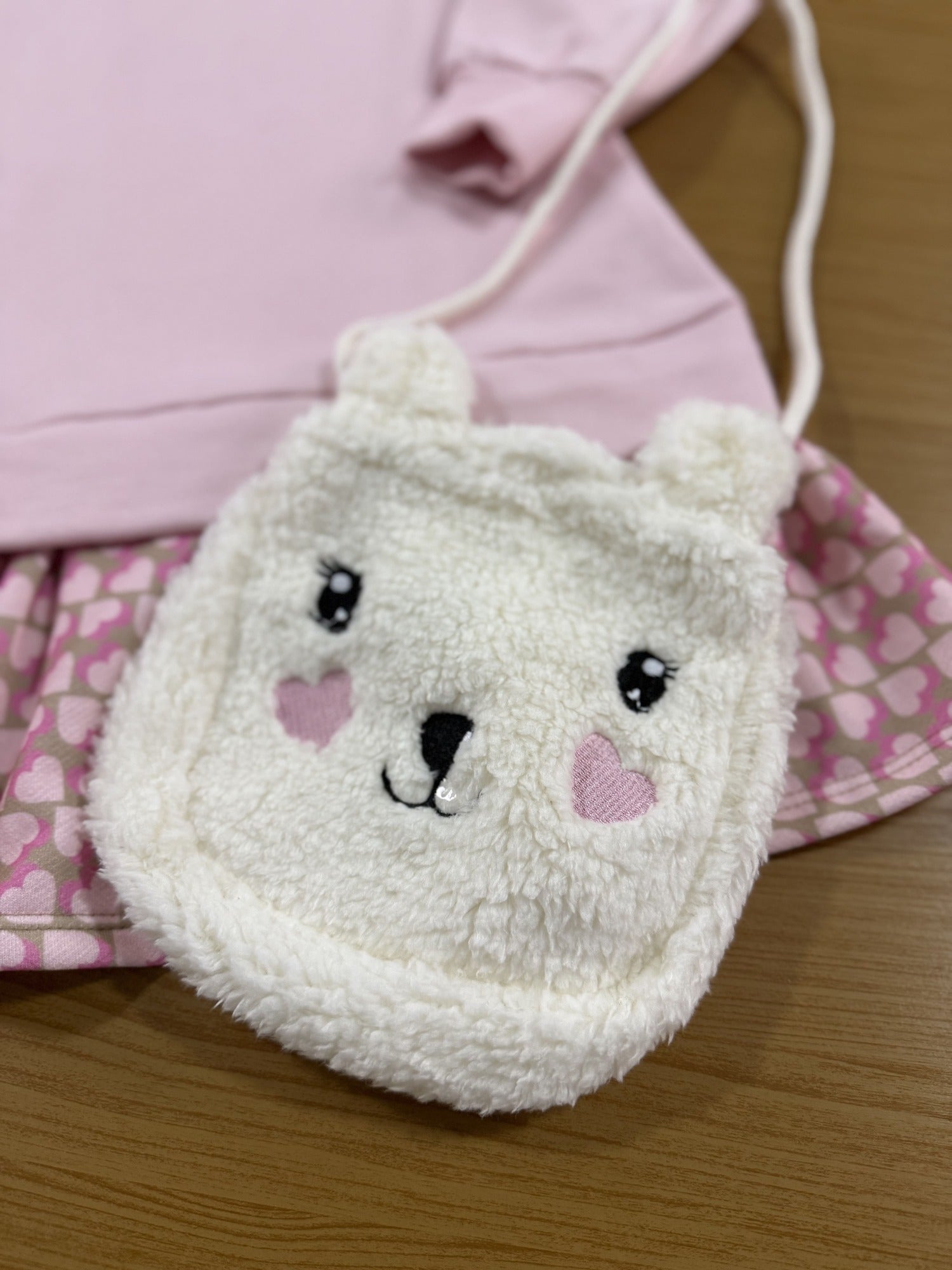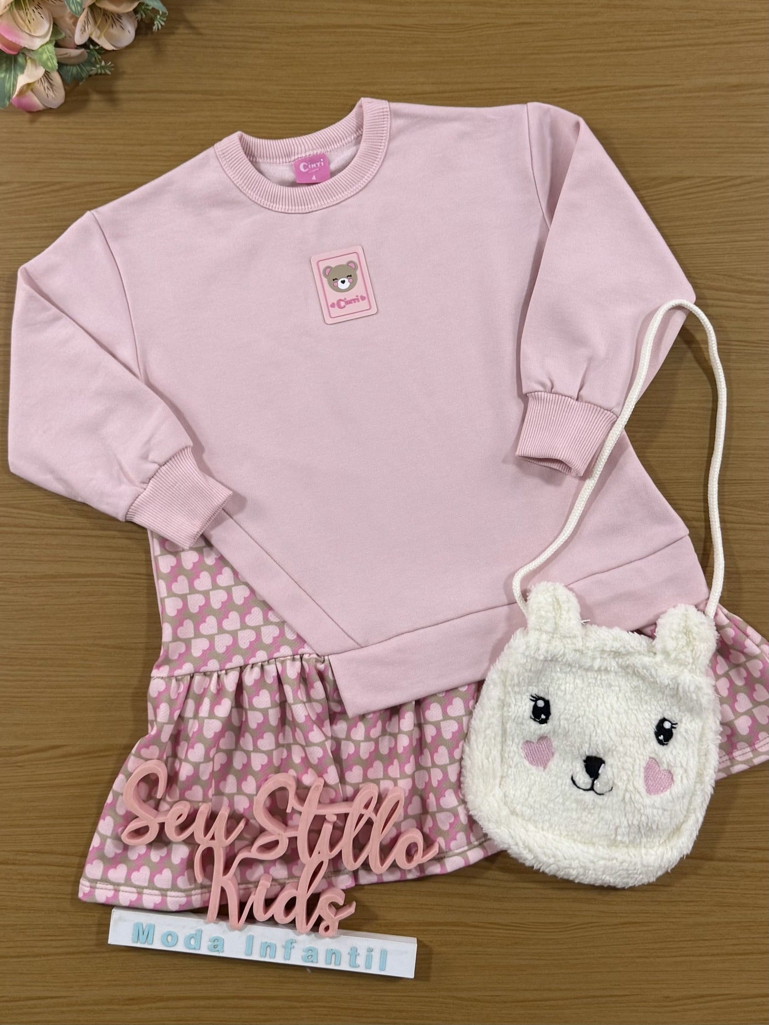 Vestido Infantil Inverno Cinti Rosa Ursinho com Bolsinha