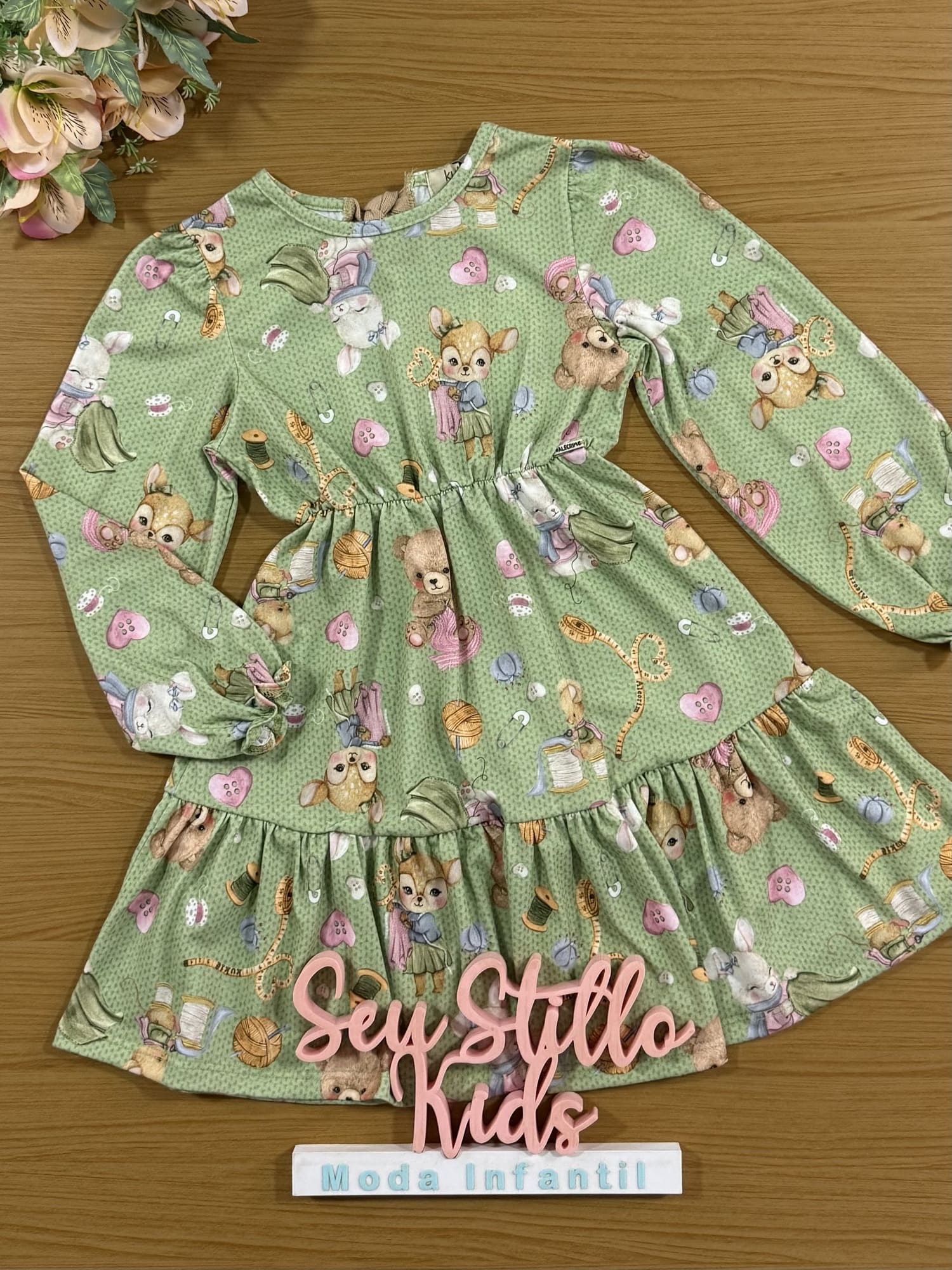 Vestido Infantil Kukiê Alecrim Inverno Verde Animais