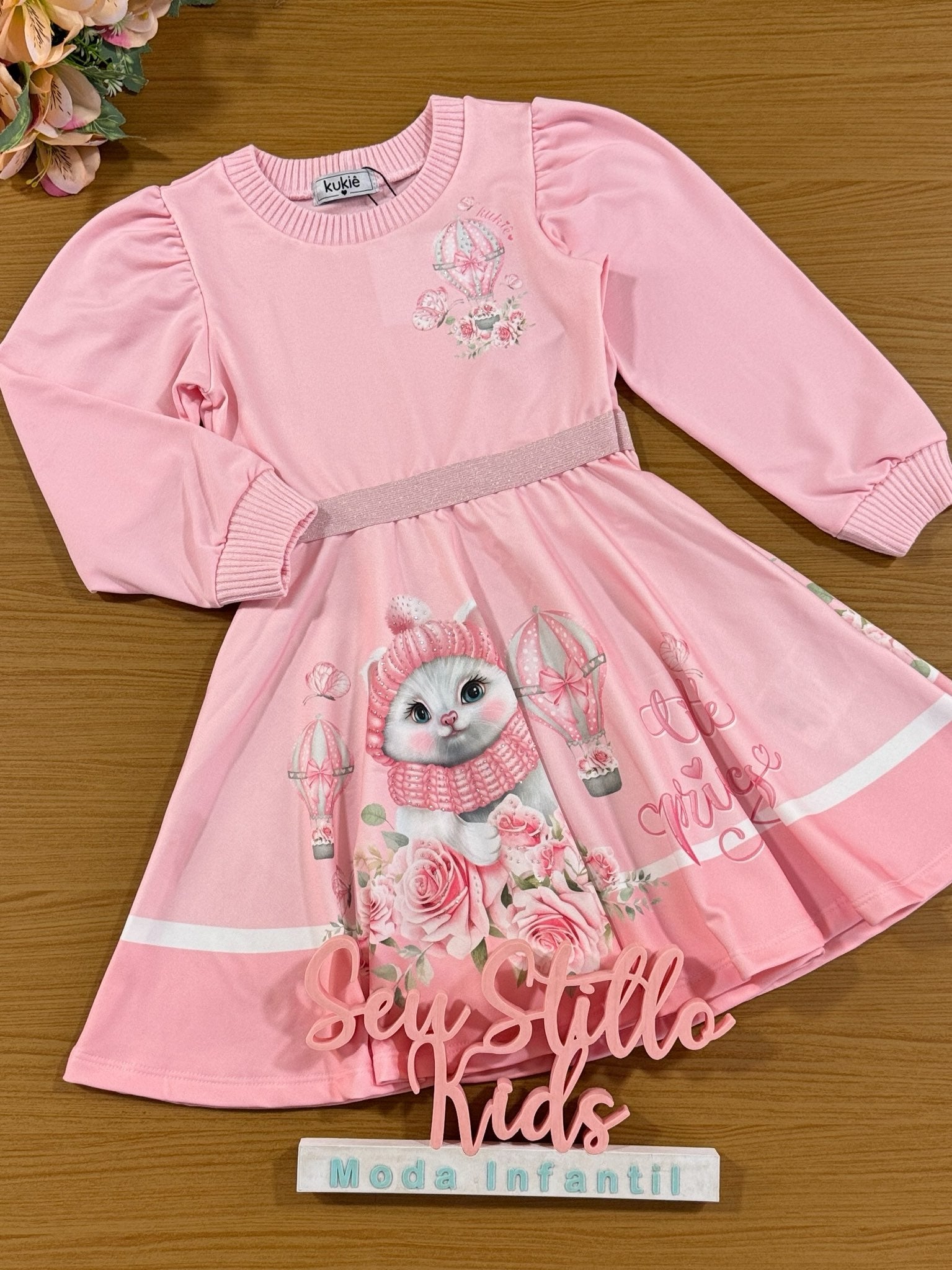 Vestido Infantil Kukie Inverno Rosa Gatinha